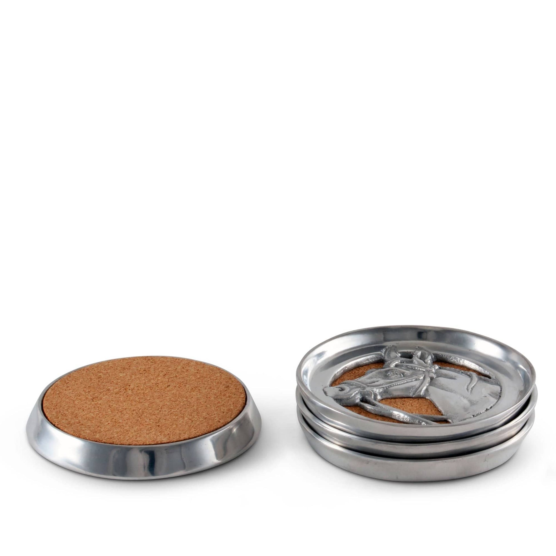 Arthur Court’s Equestrian Drink Coasters are sold in a set of four. Hand-crafted in our proprietary aluminum alloy, the round, rimmed coasters feature a detailed visage of a bridled Thoroughbred in bas- relief.