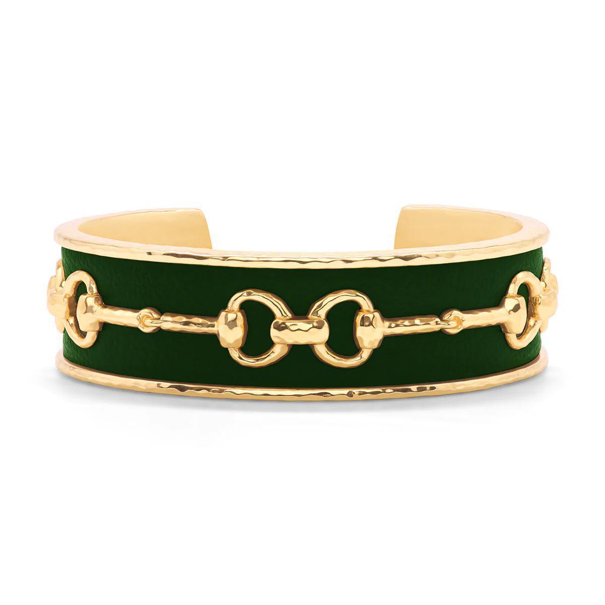 Richly hued and textural in forest green faux leather for layering into bracelet stacks or to stand alone, featuring our golden Snaffle Bit motif to represent the majesty of horses, unbound freedom and unbridled joy to carry with you, wherever you may roam.