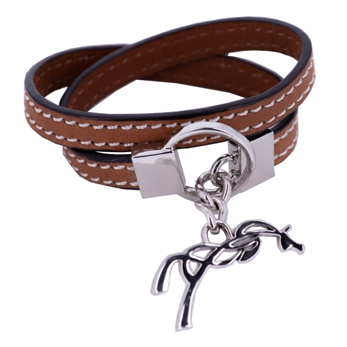 Leather bracelet with double turn, stitched with a white saddle stitch and Penelope charm. You can fasten this bracelet thanks to the logo-shaped part, which is easy to adjust to fit any wrist size!