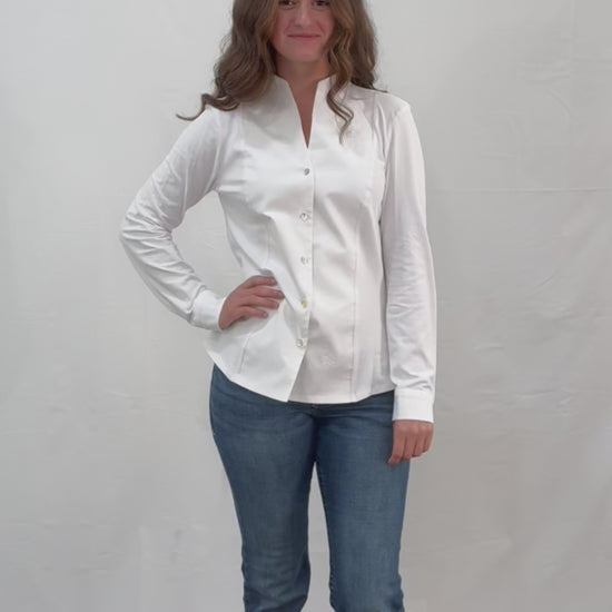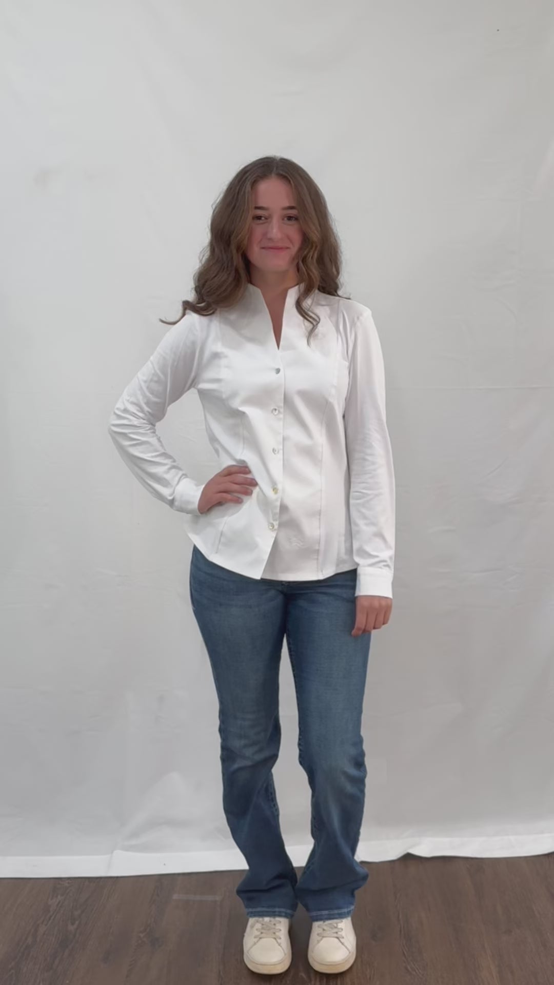 The Kate White Shirt is a sophisticated and refined, perfect for pairing with their premium jackets. This shirt offers a structured front with elasticated back and sides for maximum comfort and freedom of movement. The elongated collar adds a touch of refinement as it gracefully accentuates your neck.