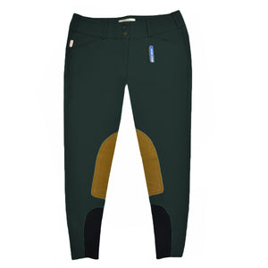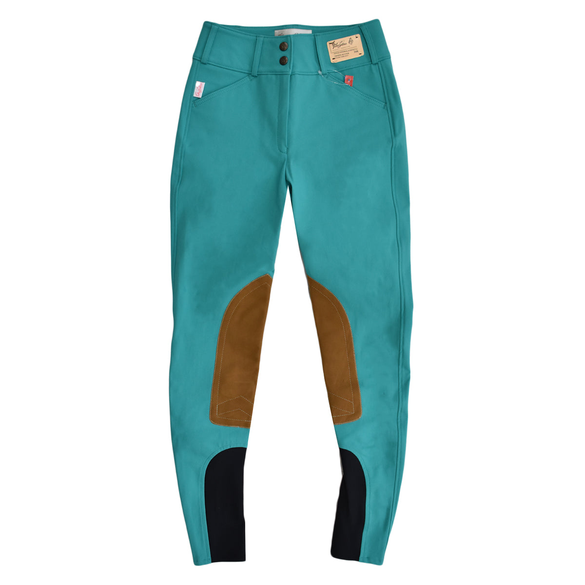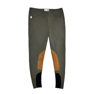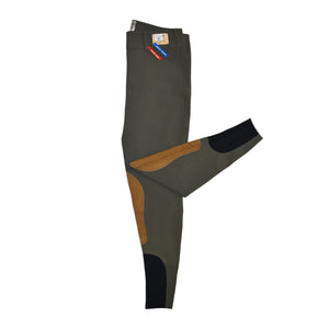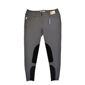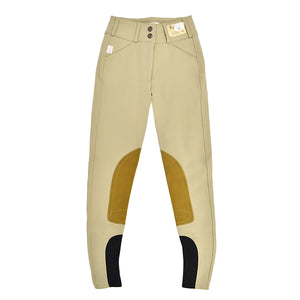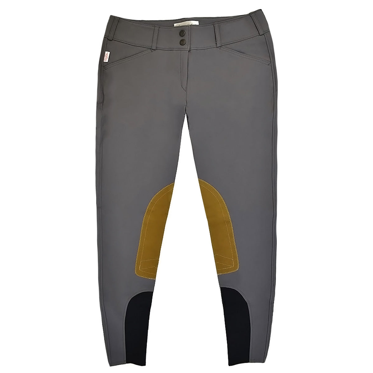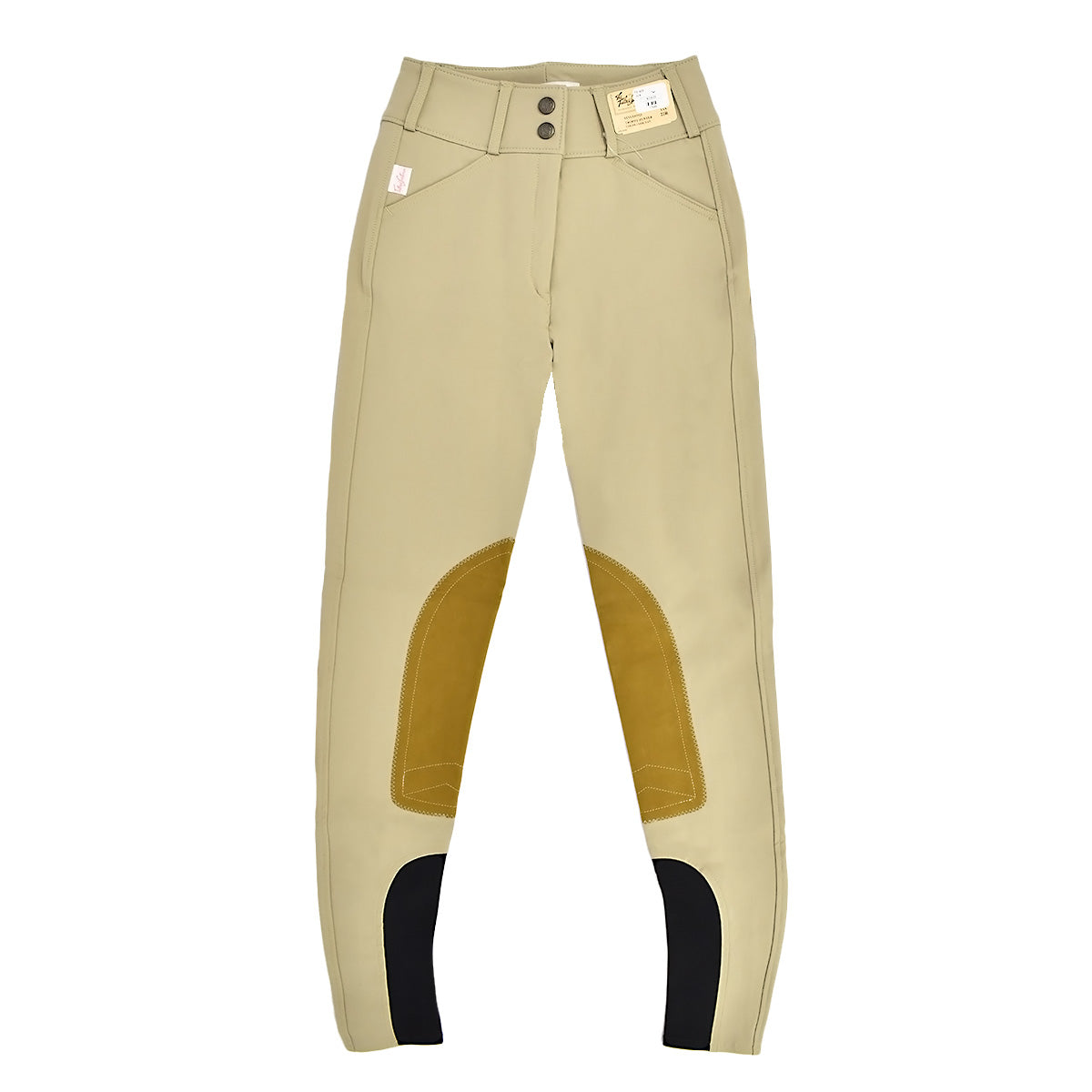 The new fabric allows for a form-fitting figure-flattering look while maintaining its shape and moving with you while you ride. Lightweight, woven 73% cotton/20% polyamide/7% Lycra, with four-way stretch for comfort. Classic European leg seams on the outside of the breech, vintage clarino knee patches, front zip, front slash pockets, and belt loops.