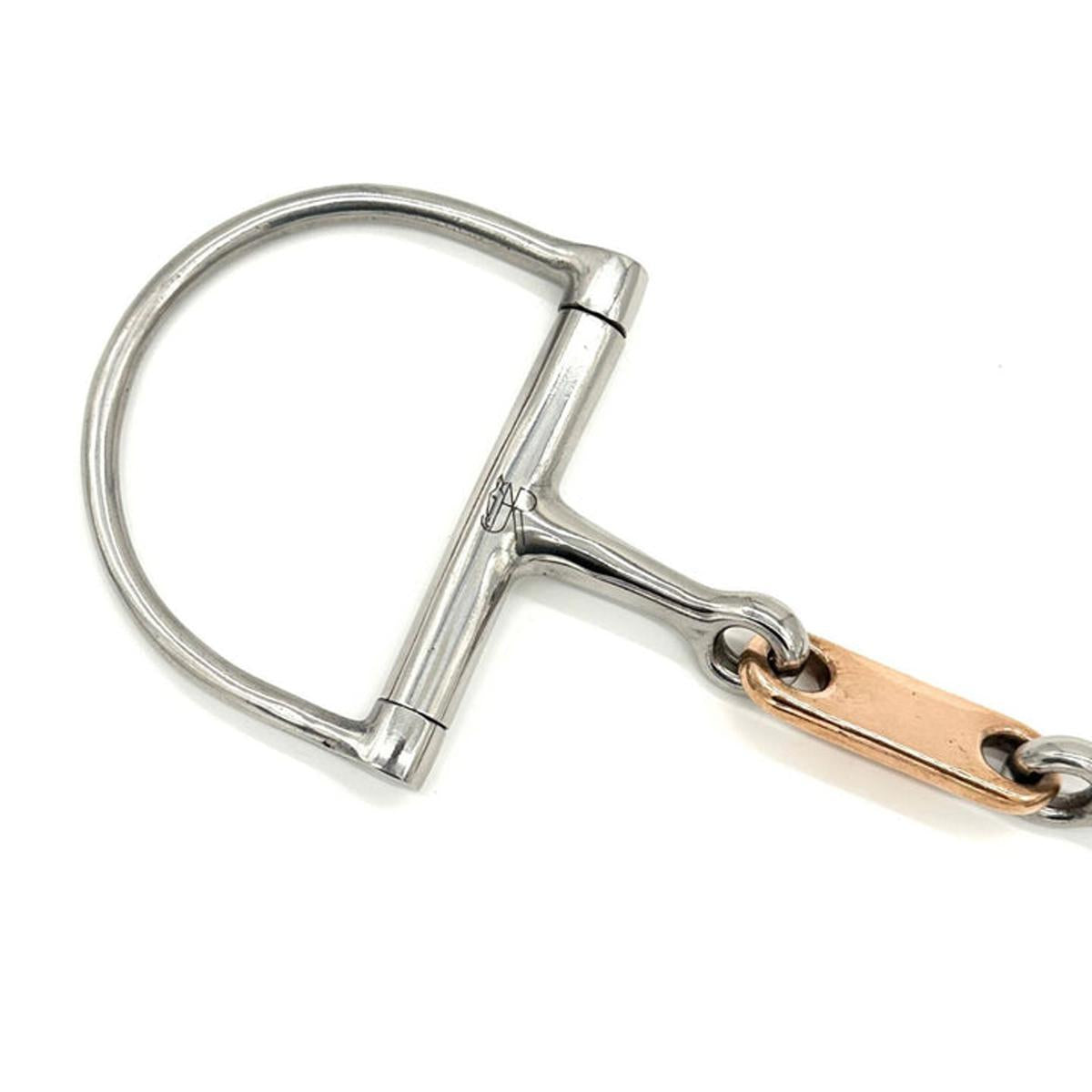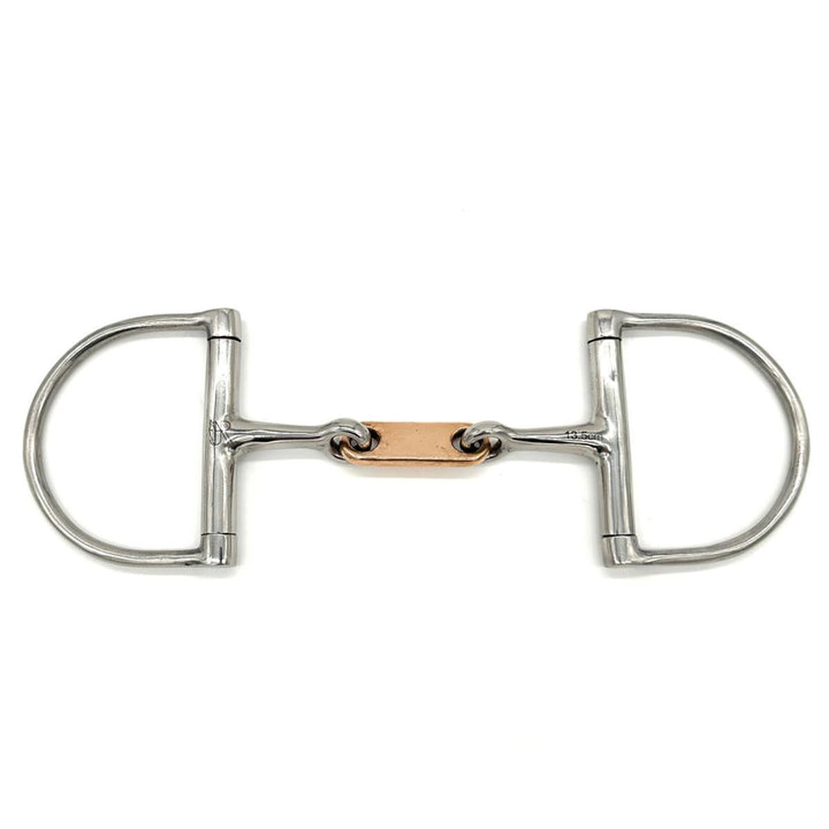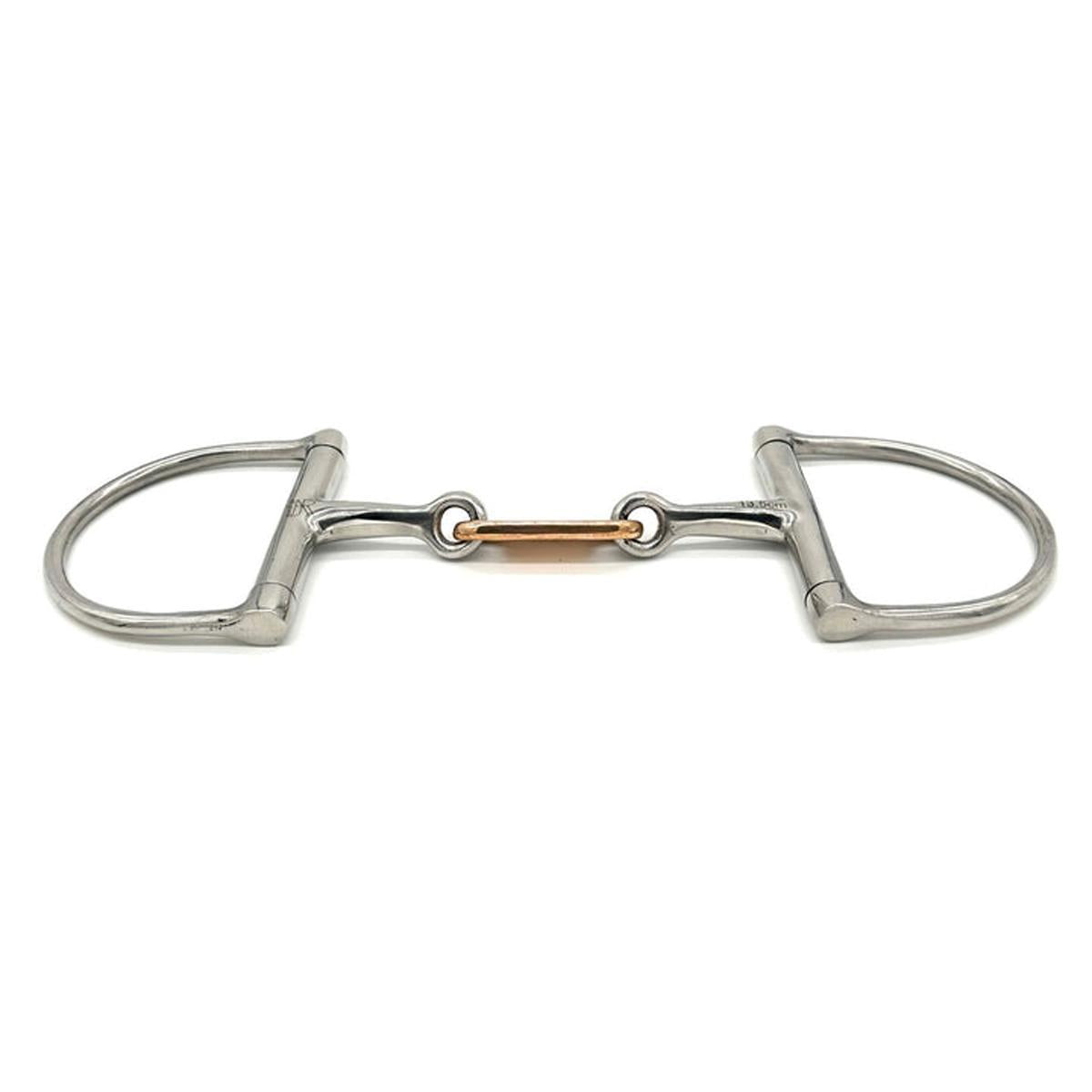 The Copper Dr. Bristol Dee Bit is designed for riders seeking a combination of precise control and added stability. This bit features a stainless steel mouthpiece with a Copper Dr. Bristol link, which is angled at 45 degrees. This specific angle allows the link to lie flatter against the horse's tongue, distributing pressure more evenly and reducing discomfort compared to traditional Dr. Bristol bits, which typically have a 90-degree angled link.