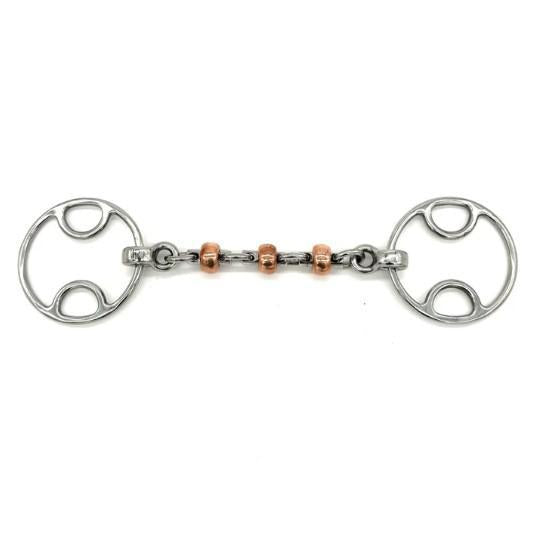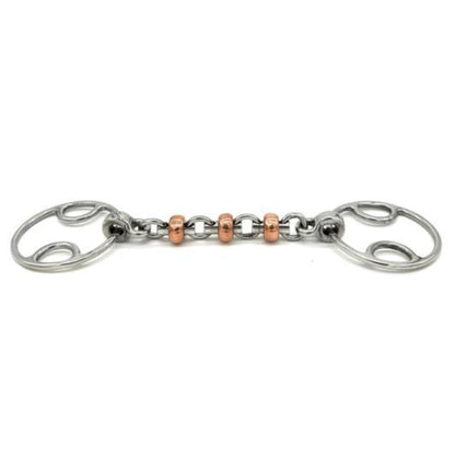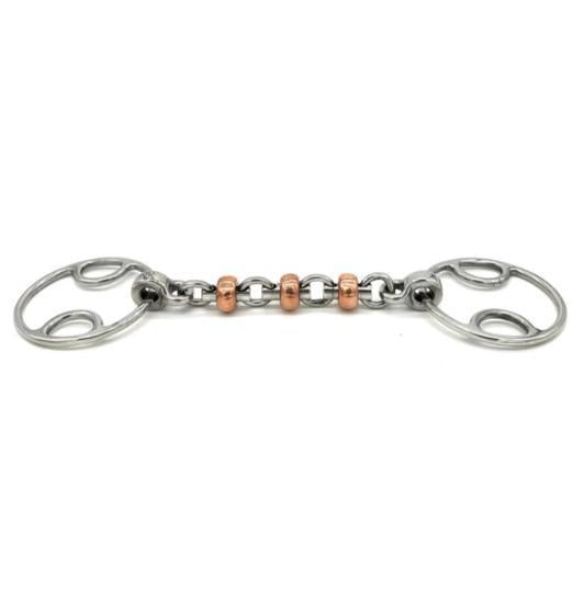 Introducing the Copper Roller Waterford Beval Bit, expertly crafted for enhanced communication and flexibility. This bit features a Waterford mouthpiece made up of multiple rounded links, which provides complete flexibility in the horse’s mouth, preventing leaning or fixing on the bit.