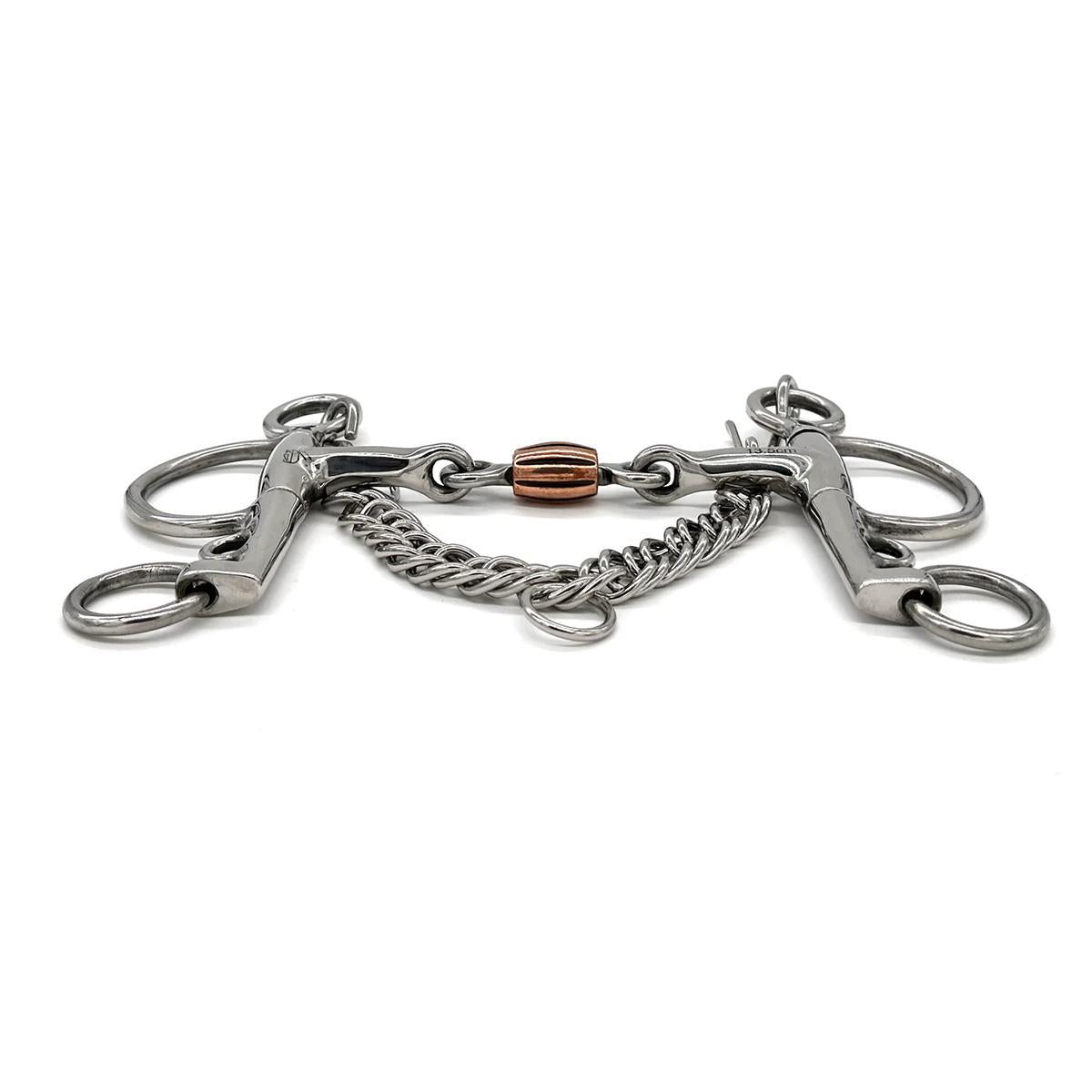 At the center of the bit lies the copper cricket roller, a distinct feature that promotes active engagement from the horse. The roller entices the horse to play, which in turn facilitates salivation and creates a more supple mouth. Furthermore, the roller produces a gentle ‘cricket’ sound, serving as an auditory cue for riders. This sound allows riders to gain insight into their horse’s mouth activity and level of comfort, enabling them to adjust their rein handling for more effective communication.