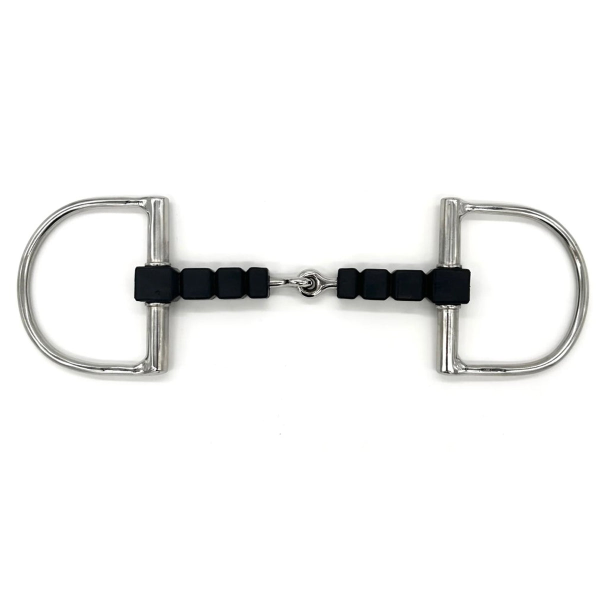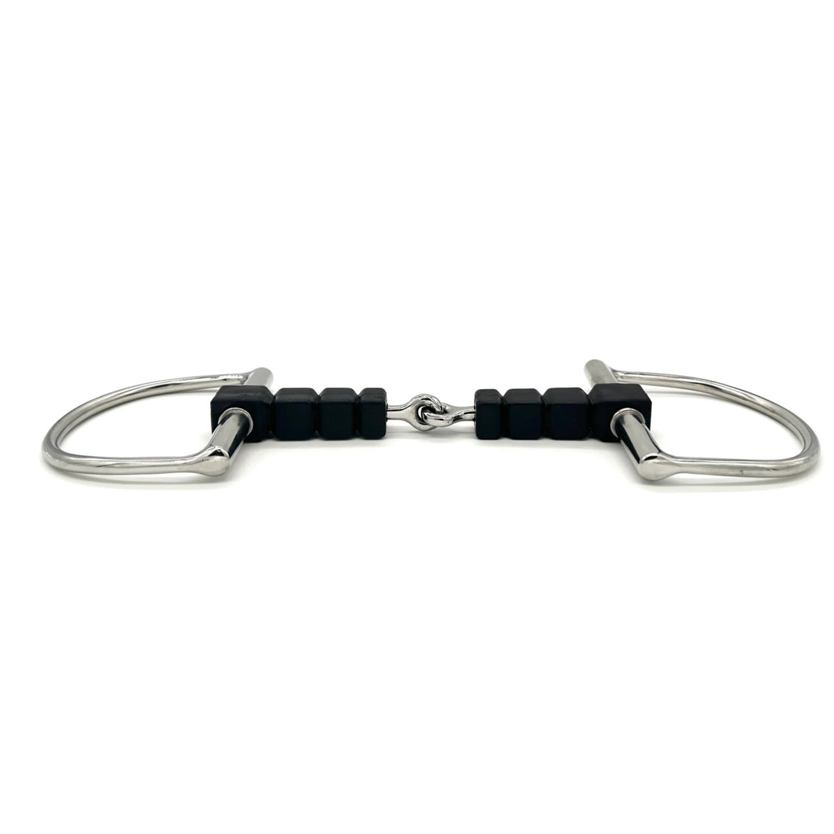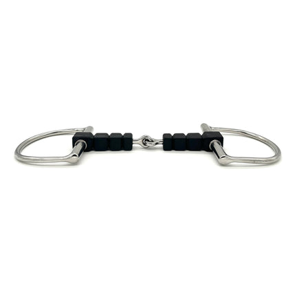 The Rubber Block D bit was designed to discourage fixing and leaning on the forehand. This softer version of AJR's traditional stainless steel block model encourages suppleness and responsiveness. When the reins are engaged, the rubber blocks apply pressure to the bars of the mouth which advises the horse to lift the balance and soften their mouth.