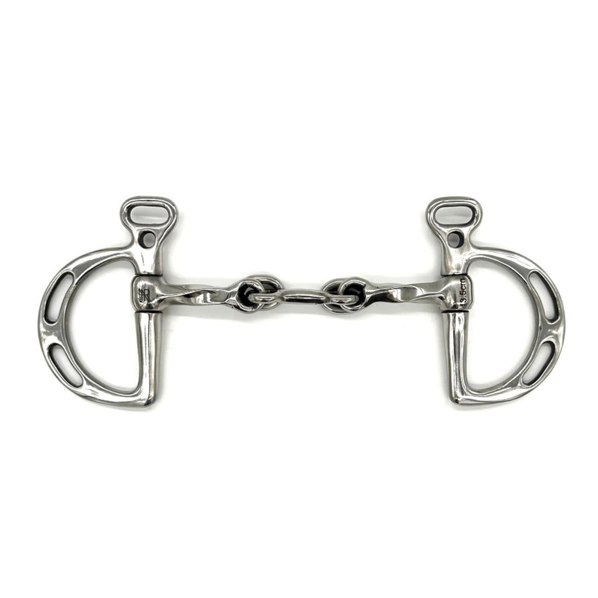 We love the twisted Locking Dog Bone Kimberwick bit. It's perfect as a training or correction bit for experienced riders looking to enhance their control and communication with their horse. Crafted with precision, this bit features a Kimberwick cheek piece design that transforms the mouthpiece from a double broken to a straight bar when pressure is applied to the reins. The Kimberwick cheek piece provides a mild leveraged action, allowing you to effectively manage horses that tend to go against the hand. Once the pressure is released, the bit seamlessly changes back to its original double-jointed mouthpiece.