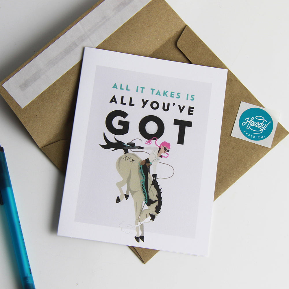 Part of our Howdy! Western + Everyday Collection. Show your support when times get tough for those you love. Sometimes all they need is a little reminder to give it all they've got, and hard work always pays off! Horse people encourage each other and empower our fellow equestrians to keep those heels down and use more leg. Giddy up, time to take life by the horns and DIG IN!