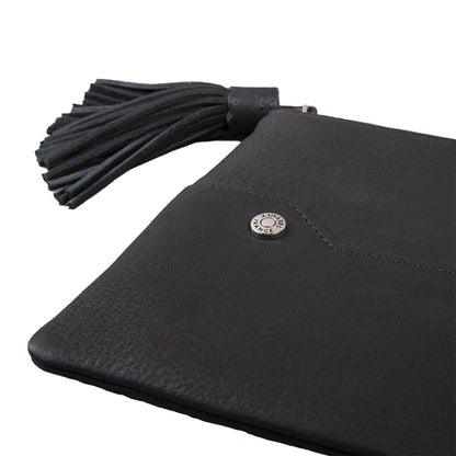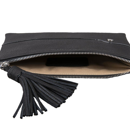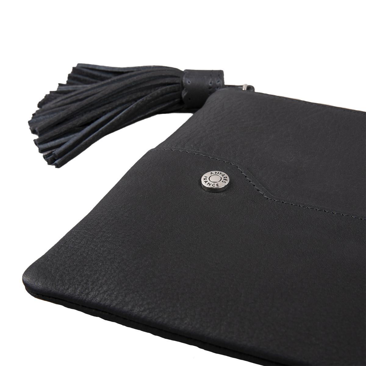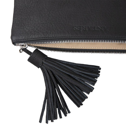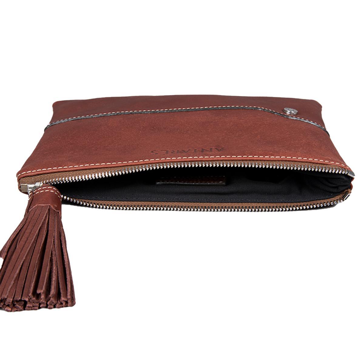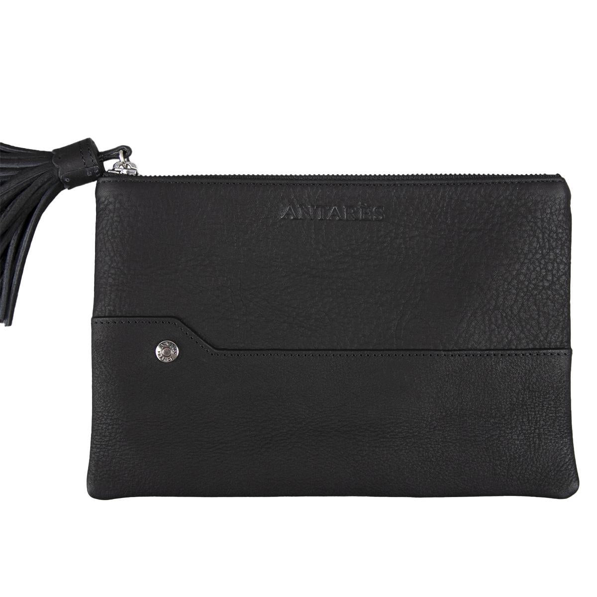 The London Clutch features a silver zipper and a leather fringe charm, showcasing the Antares logo both inside and on the front. It includes a distinctive Antares saddle stud and is lined with fabric for durability.