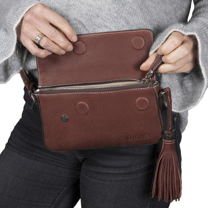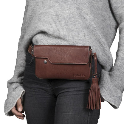 Crafted from leftover French leather from Antares saddles, this clutch bag combines style and sustainability. It features a detachable double leather strap that reaches hip length, a secure zipper closure, and a sturdy magnetic flap. Side rings allow you to convert it into a handbag, while back loops let you wear it as a shoulder or belt bag, keeping your hands free.