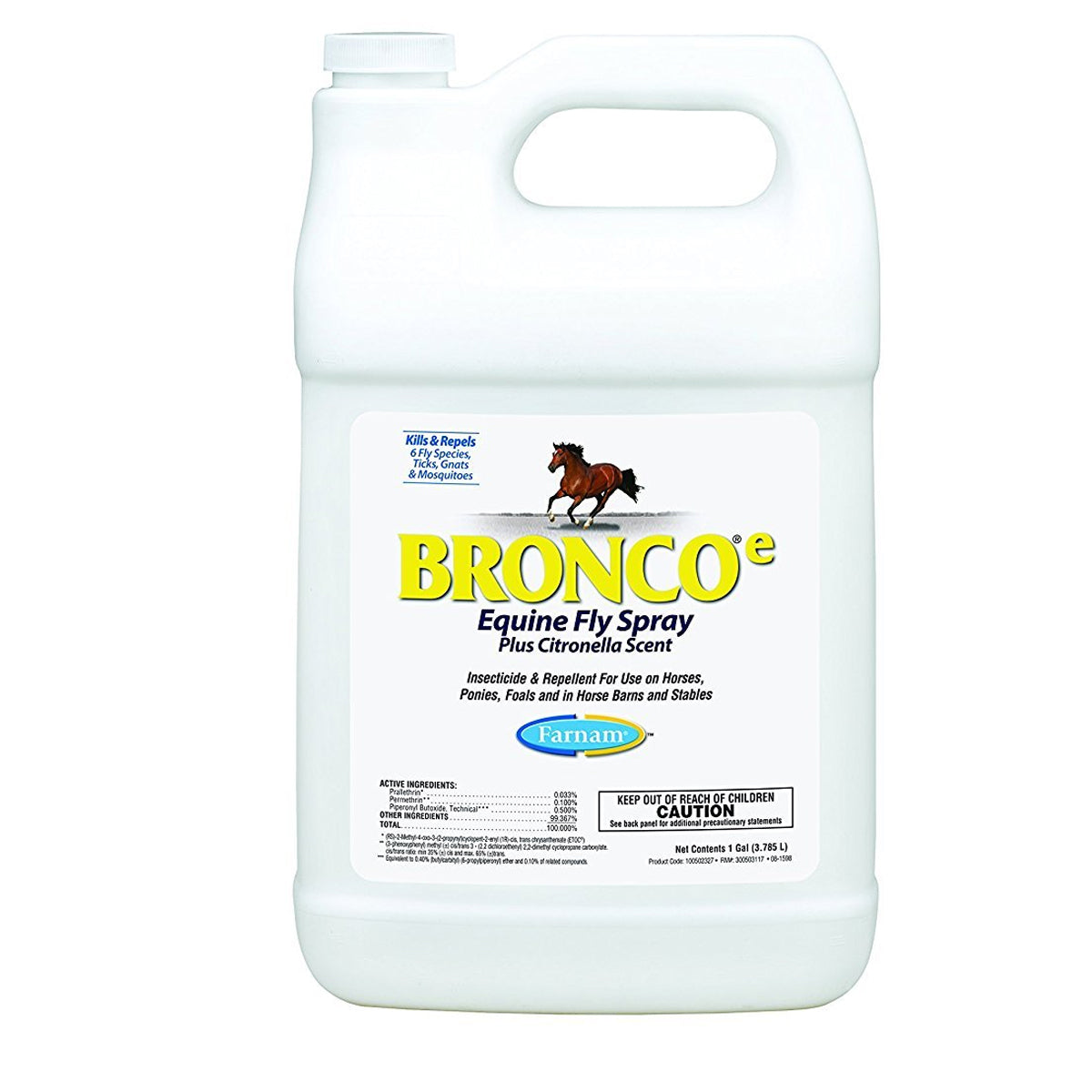 Bronco-E Fly Spray ready-to-use, water base formula kills stable, horse, face, deer, house, horn flies, gnats, ticks, fleas, chiggers and lice. Contains Prallethrin, Permethrin and Piperonyl Butoxide.