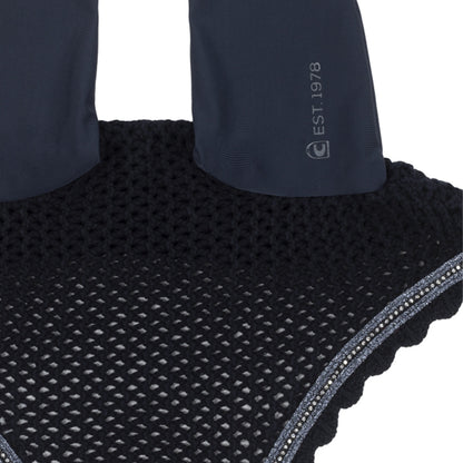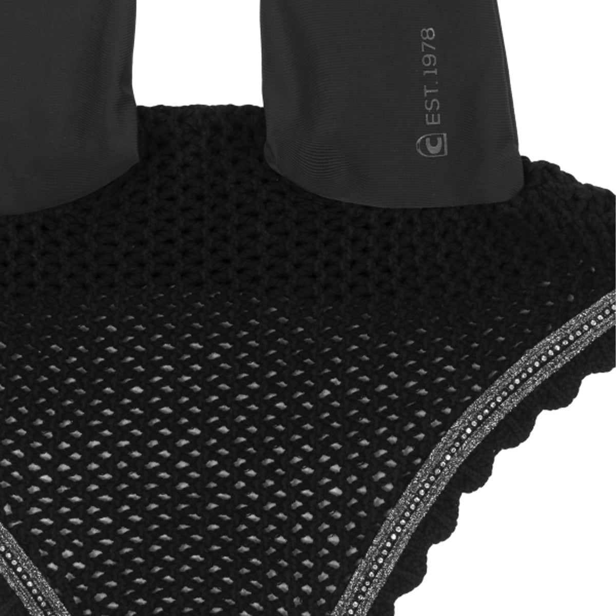 We love this Jetty fly hood as it has a unique and elegant crochet design. This specific fly bonnet is made of quick-drying, skin-friendly jersey in the ear area. Cavallo lettering in gunmetal look is printed on the left ear. Head cover in crochet look. Edged with two tapes and a crystal band in the middle. This decoration frames the fly ears perfectly and makes them a real eye-catcher.