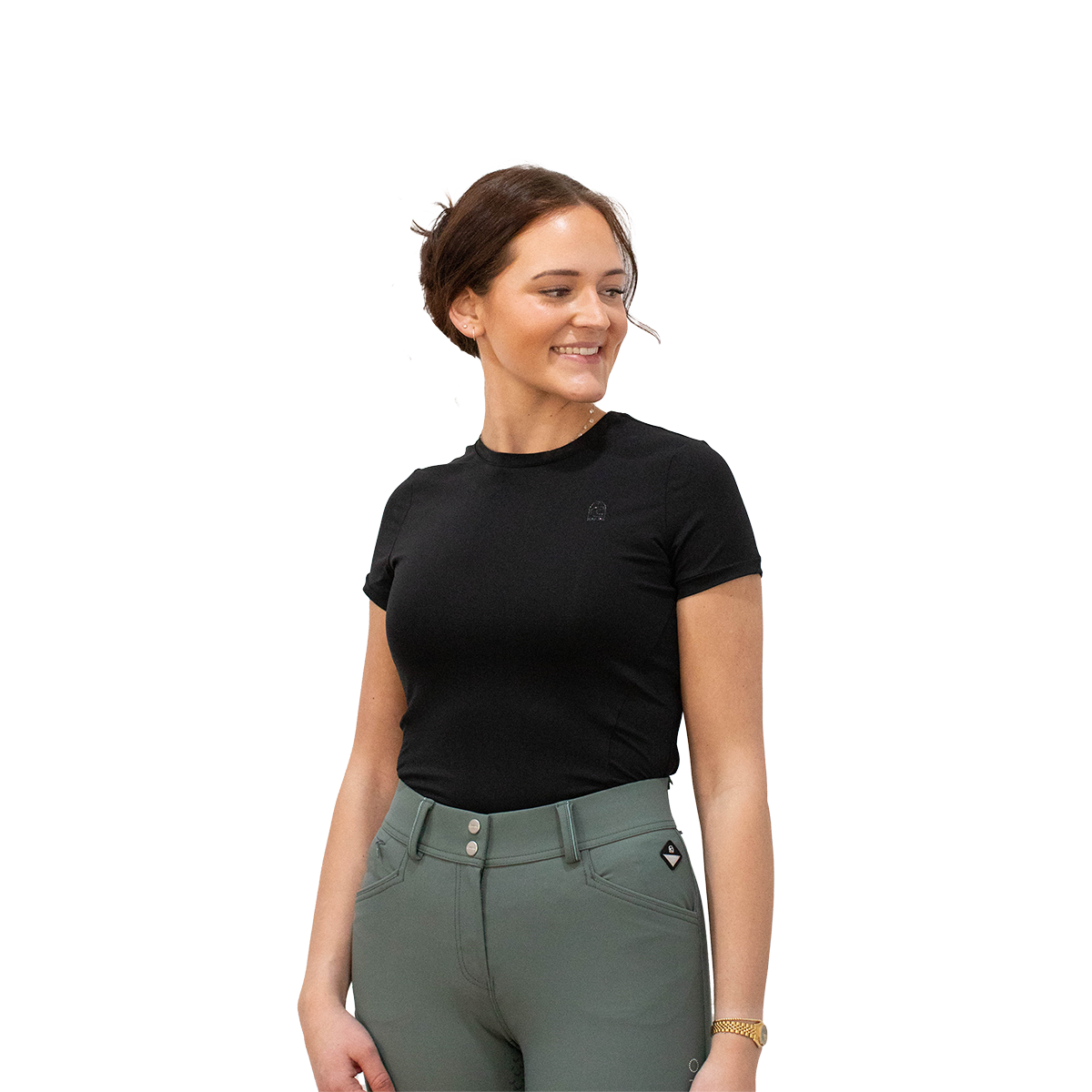 Cavallo laser-cut artwork in the center back, decorated with crystal stones and print. All laser-cut artwork is lined with tonal mesh and outer fabric and is therefore not translucent.
