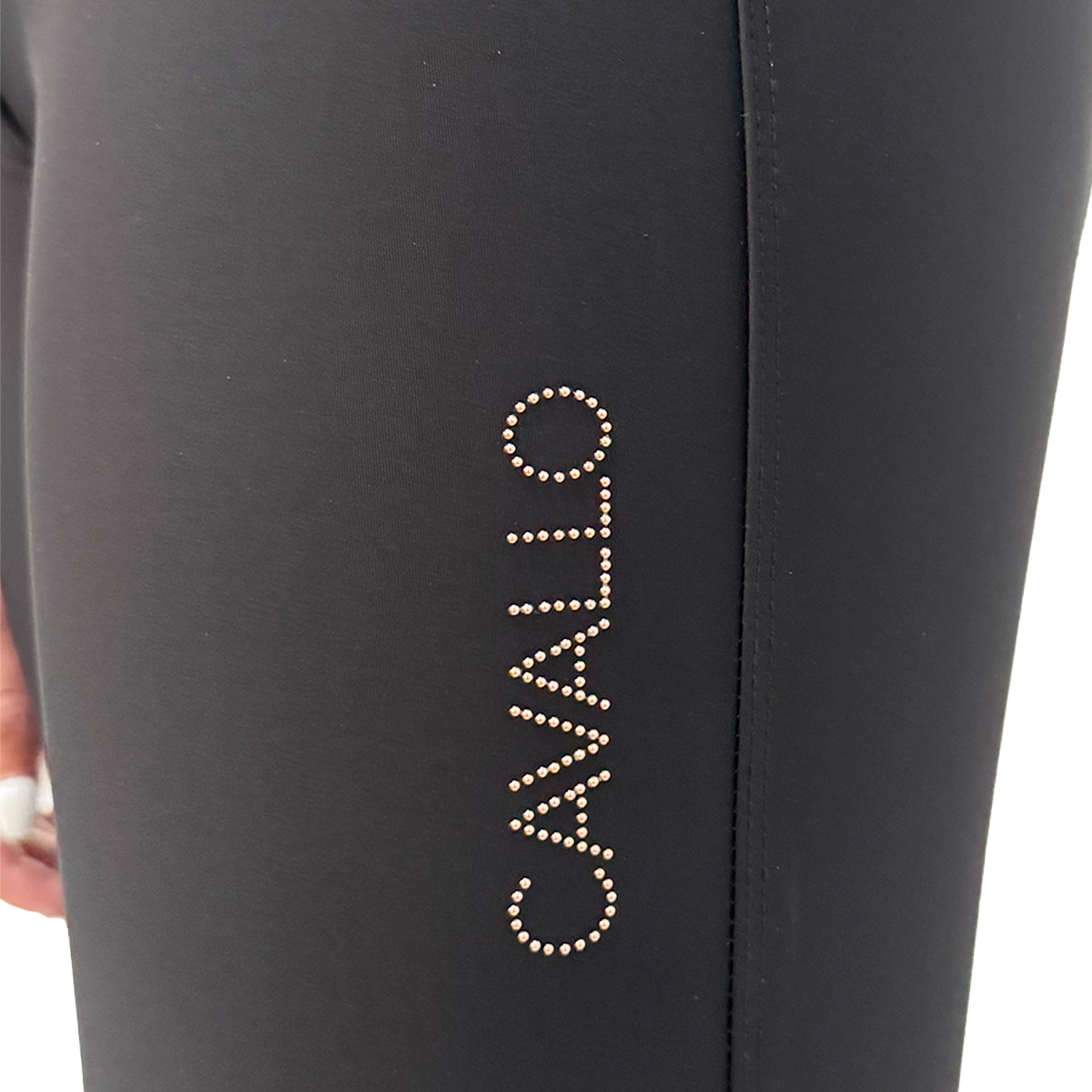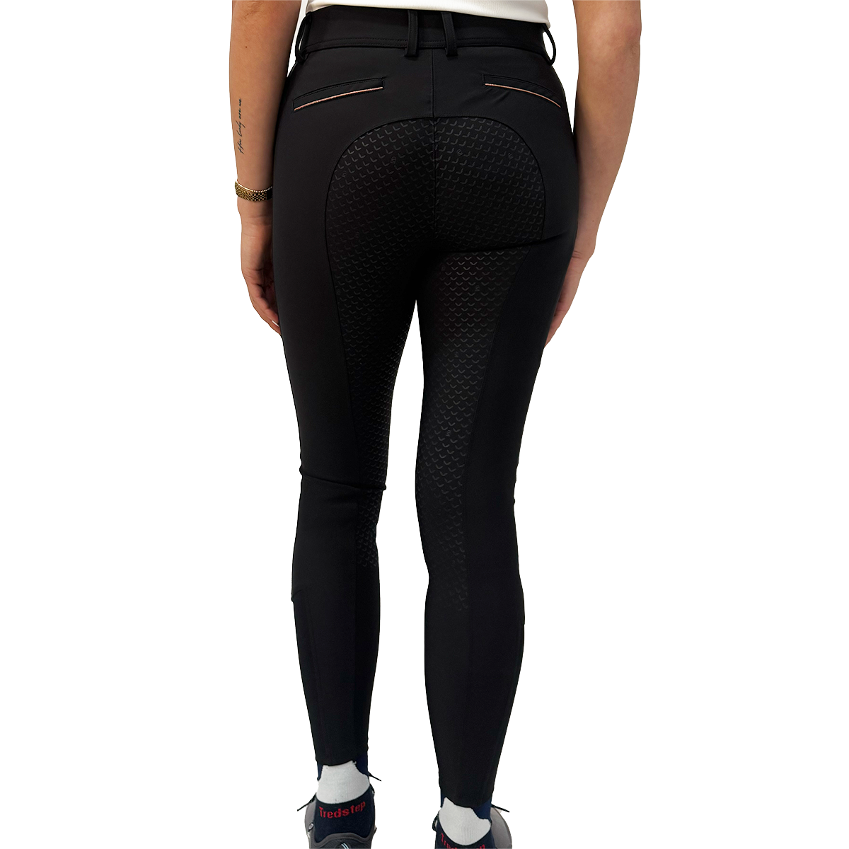 The breeches have a particularly comfortable outer fabric. There is piping on the belt loops and back welt pockets. Included are two front pockets, and a small coin pocket below the waistband. There is a mobile phone pocket on the right thigh, and high-quality nail head artwork on the left thigh.