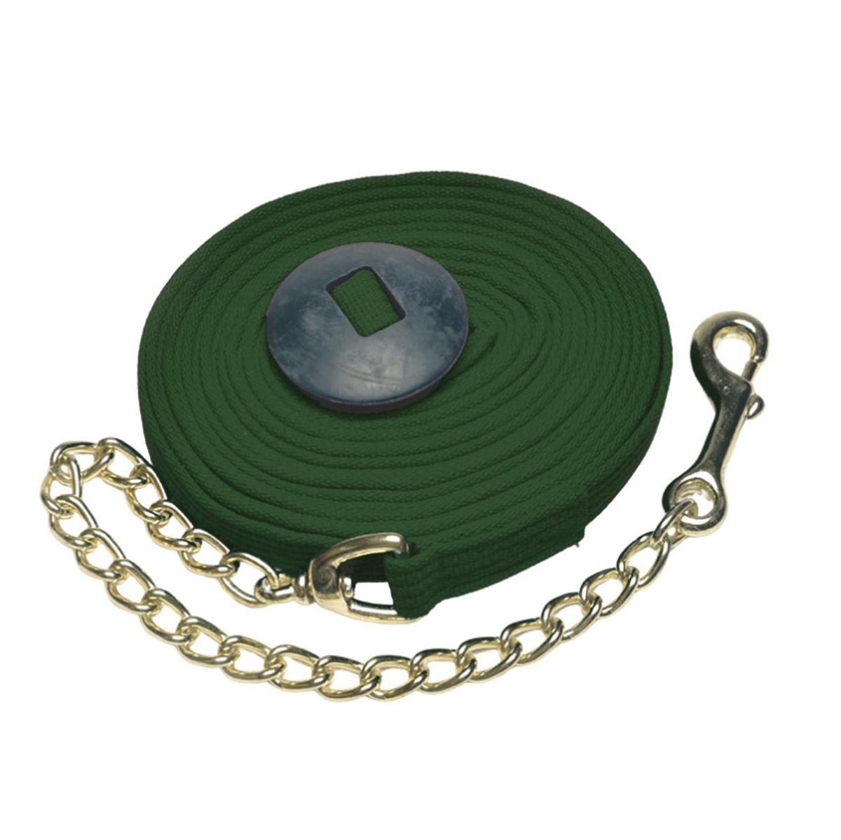 These sturdy lunge lines are made with 100 percent cotton webbing. They have a handy rubber donut stitched to a handpiece for better control. It measures 25 feet long with a 20-inch brass plated chain.