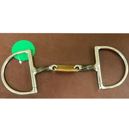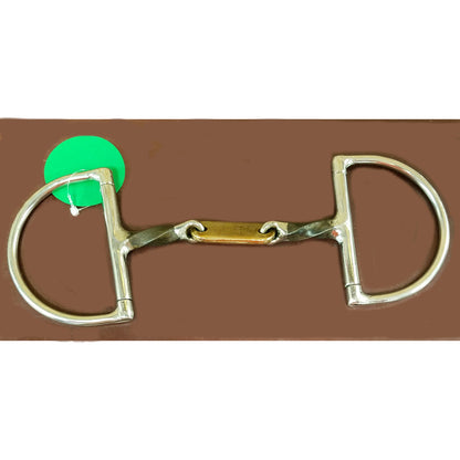 This bit is a traditional hunter D ring snaffle with twisted sweet iron at the bars with a copper Dr. Bristol style plate in the center. Ergonomically designed for the horse's mouth, this bit offers a bit more bite than a traditional Dr. Bristol or twisted wire bit, while still maintaining the classic hunter-style look.