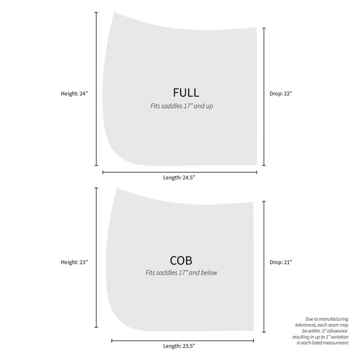 Not only are these pads beautiful to look at, but they are impeccably crafted by their manufacturing partner. No detail has gone overlooked, from the dirt-repelling top layer, the non-slip underside, and soft yet substantial padding. These pads are incredibly high quality and built to perform! The Full size is ideal for saddles 17" and up, and the Cob size will work for saddles 17" and under.
