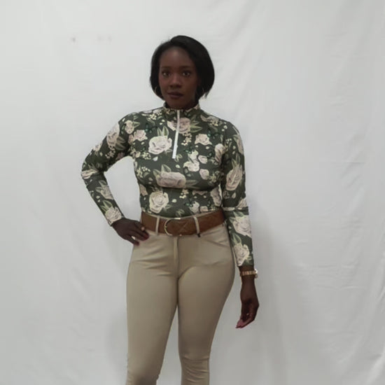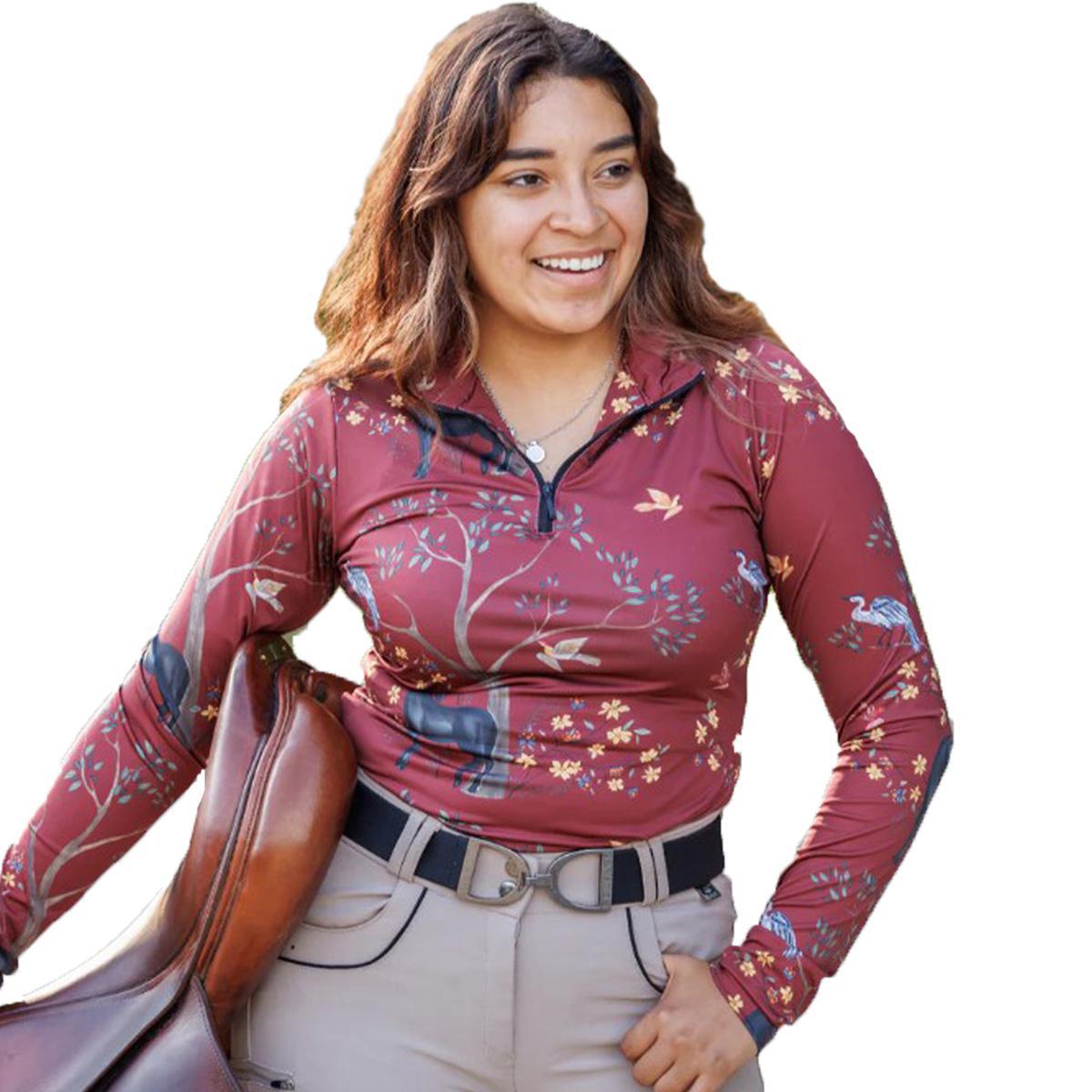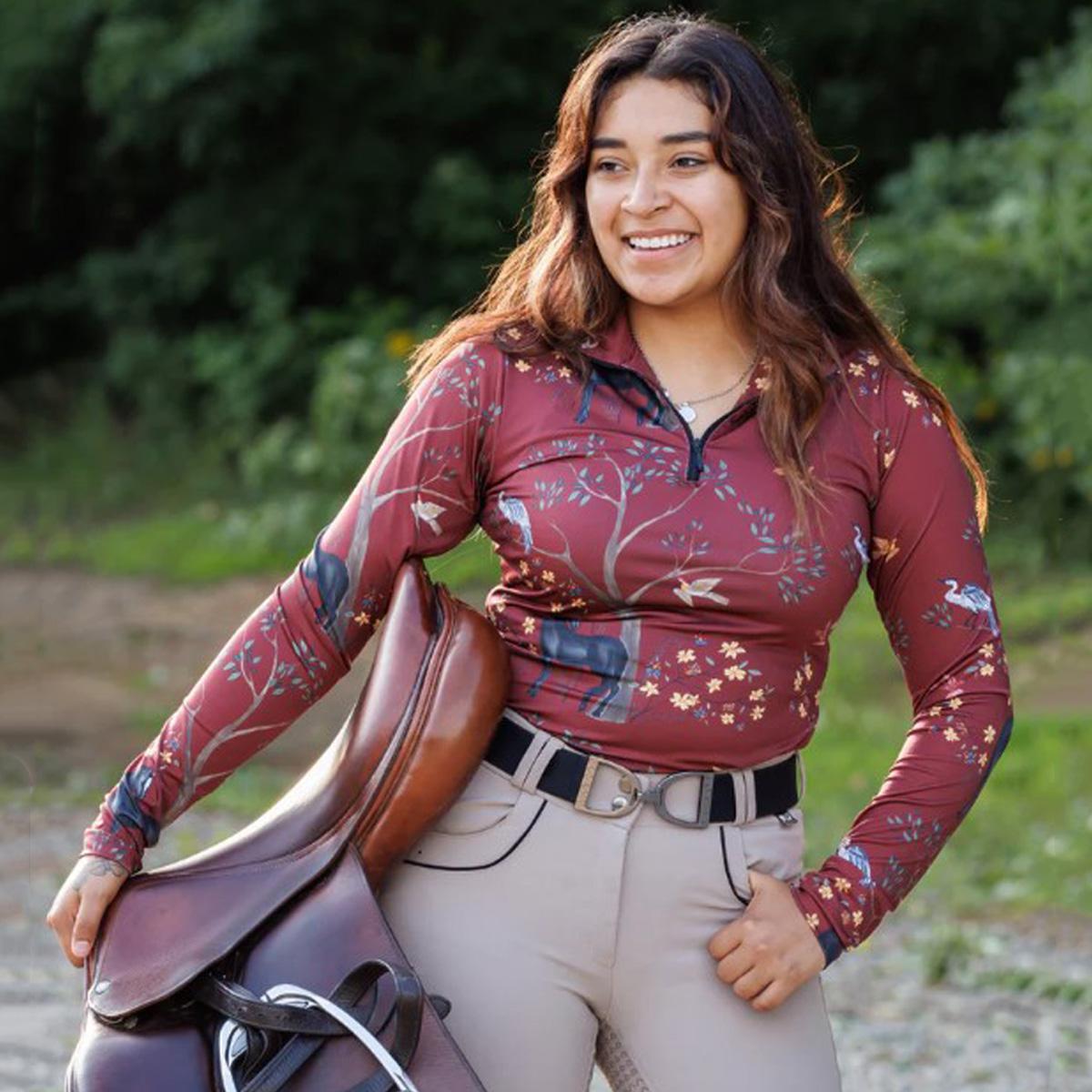 GRETCHEN: "Our GRETCHEN design is brought forward with (and named after!) the owner of Salado Creek Tack Shop, one of Deinhardt Designs' very first retailers. Here is a note from our Founder about this design: The story of how Gretchen and I met is the perfect way to explain her namesake print - Plus it's a great story! While hanging out in the Halter Ego® booth at a tradeshow, I crossed paths with Gretchen while we were both sipping wine and rifling through bags of products while kneeling on the floor. I was wearing one of my shirts, which caught her eye - before I knew it I was taking an order! But it was the Monarch design that really sealed the deal. When she saw it she shared a story with me about her childhood friend that had passed from Lymphoma. She said she has always been drawn to butterflies because they are often used to symbolize Lymphoma Awareness. We spoke that day, during that first meeting, about her someday wanting to design a print with me in honor of her friend - and almost 2 years later, here 'The Gretchen' is!"