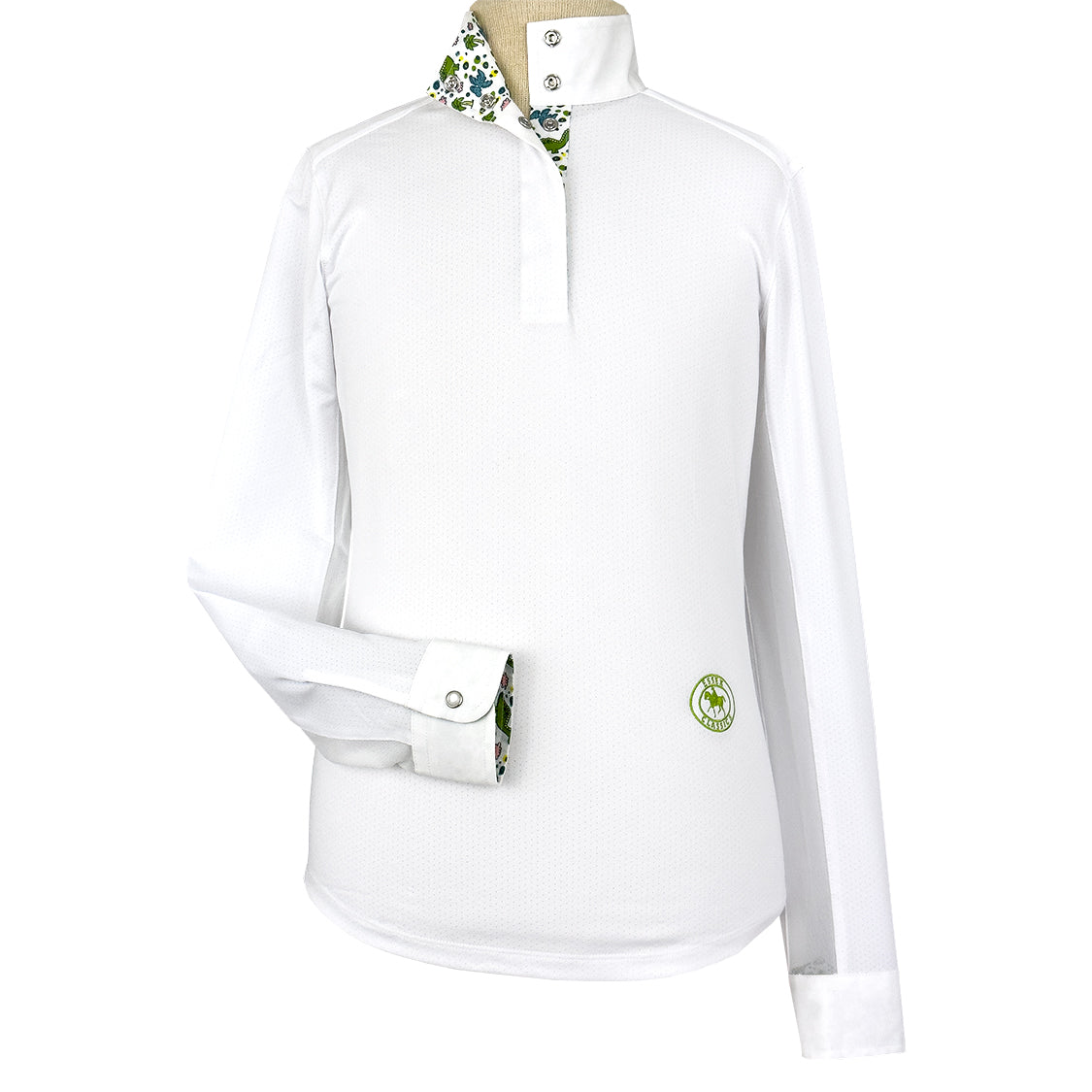Our Talent Yarn® Show Shirt is the classic choice for looking crisp and polished in the show ring. Expertly tailored in easy pullover style with a gently tapered body fit for a neat appearance with or without your show coat. Unsnap the collar to show our exclusive fabric trim. Smart, thermoregulating technology helps maintain an optimal body temperature. Moisture wicking and deodorizing antimicrobial properties provide quick dry and stay fresh benefits that never wash out. Stain resistance helps keep your shirt looking new wash after wash. Breathable, stretch Talent Yarn keeps you comfortable in the saddle even on the longest days.