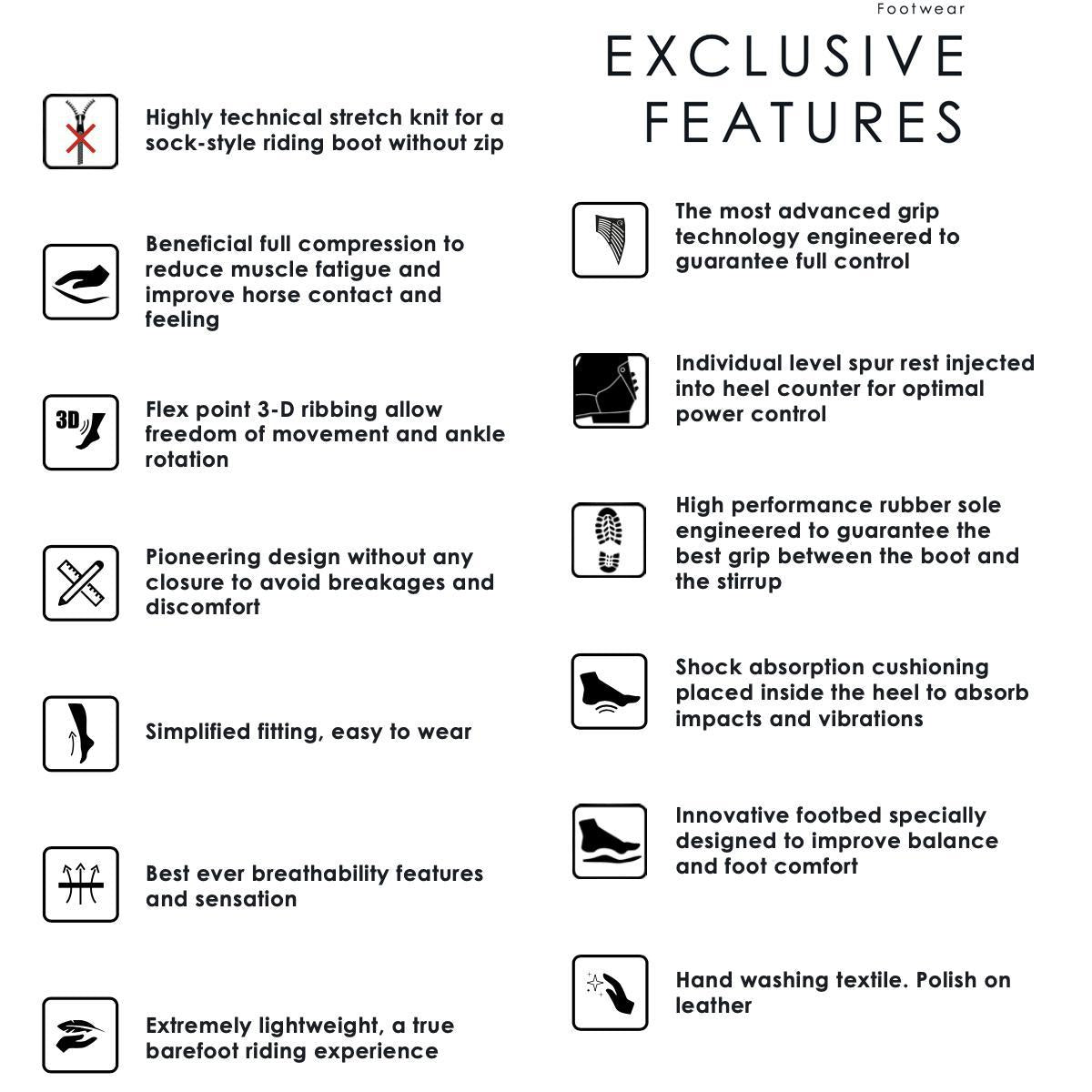 - Highly technical stretch knit for a sock-style riding boot without zip