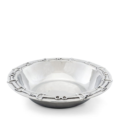 Attract your horse-loving friends with this crafty 12" Equestrian Bowl from Arthur Court. Bits connect around the edge of this piece as leathery straps wrap around the rein rings and fasten into a buckle. The circular pattern draws your eyes into the middle of this handmade, aluminum bowl.