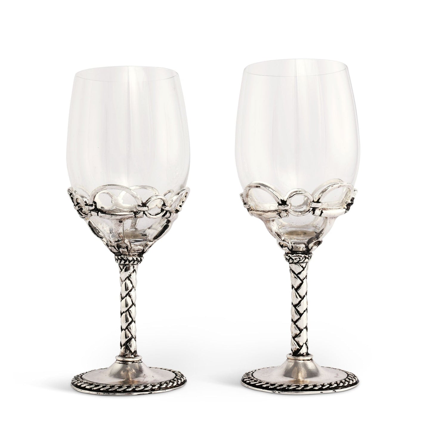The wine glasses feature enchanting details that any horse lover will encounter fascinating, the base is rounded by a beautiful curb chain, the stem depicts a fine horsewhip and the bowl details a delicate rein rings pattern.