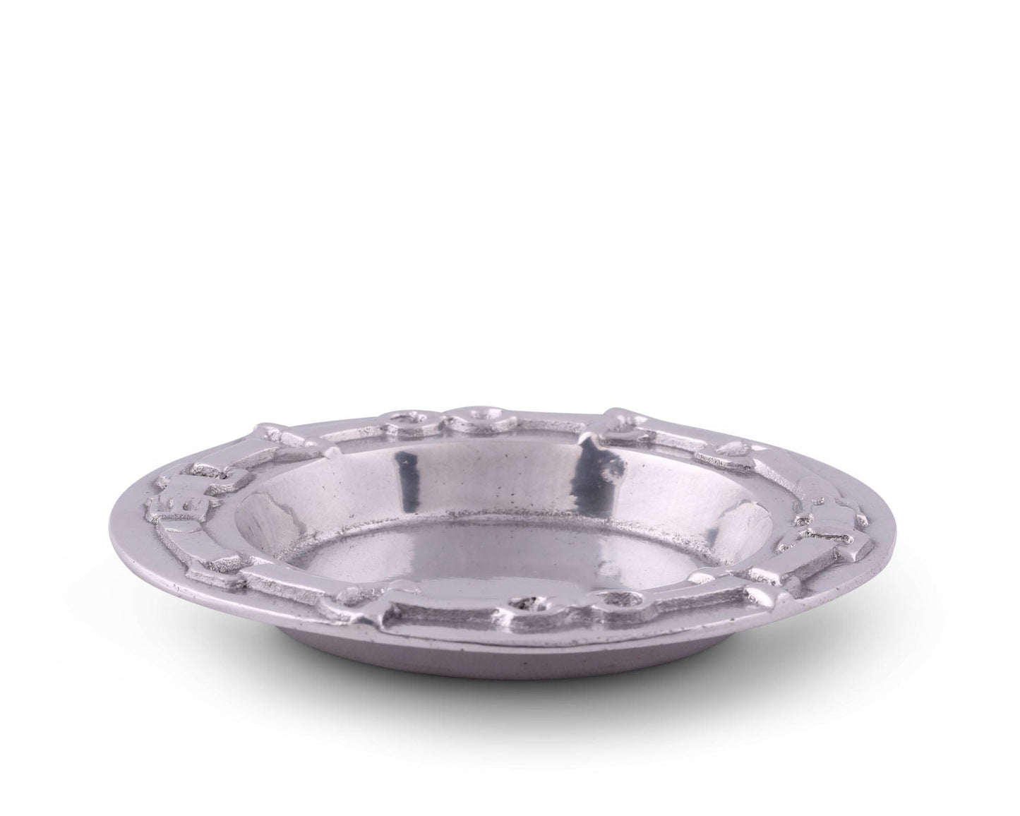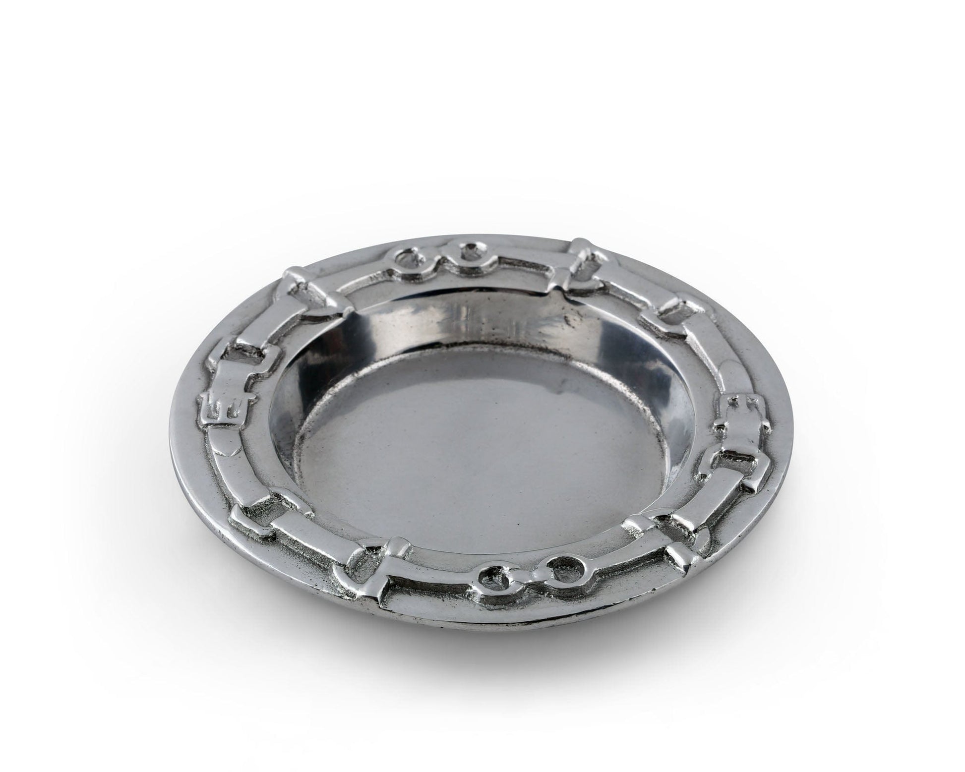 Leathery straps connect bits through interlocking squares to create a textured border around the edge of this piece. The symmetrical design accentuates the otherwise smooth finish of this handmade, aluminum coaster.