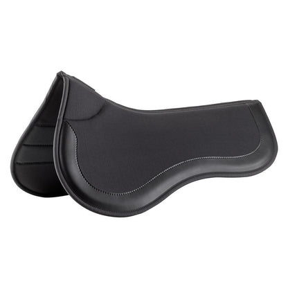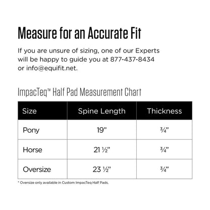 A close-contact version of our original ImpacTeq Half Pad. Absorbs concussion using a carefully-selected, low profile open cell foam found in sports equipment and technical footwear. Multi-dimensional air mesh layer promotes airflow and circulation. Distributes and reduces harmful pressure points under the saddle; 0.75" thick. Provides ample room for withers and spine. Recovers to the orginal shape after each use. Grippy strips on the underside help stabilize the pad for minimal movement. Resistant to water, scratches, punches and tears. Includes materials that discourage bacterial growth. Wipes clean with a damp cloth. Easily transition from the jumper ring to the hunter ring.