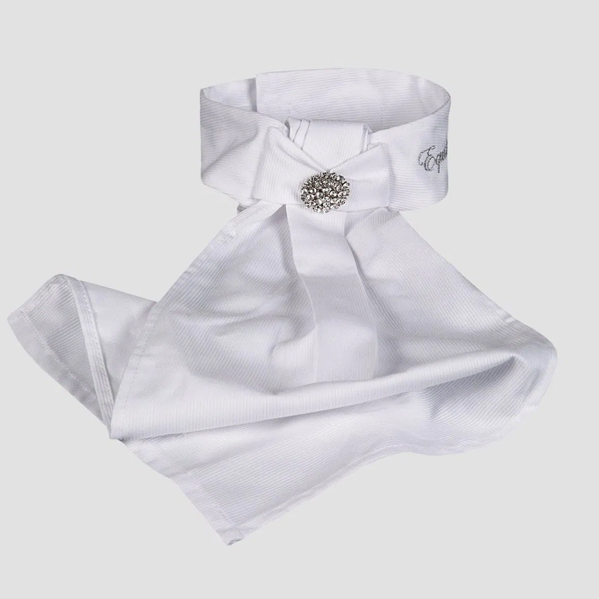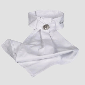 Stock tie featuring a pleated collar and two centered rhinestones. Additional features include embroidered silver Equiline lettering on the side. Back velcro closure. Looking to add some glam to your show ensemble? The ADEL is the perfect stock tie for that!