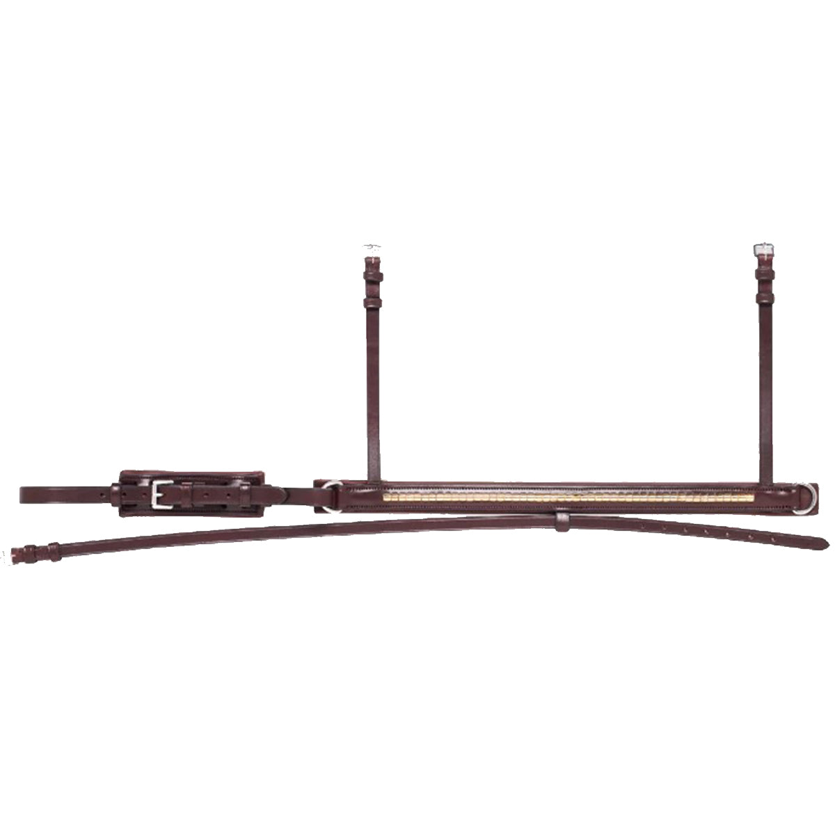 We love the Equiline gold clincher flash noseband with crank for precise adjustment. Wide, soft padded tab under closing buckles to avoid any rub or pinch.