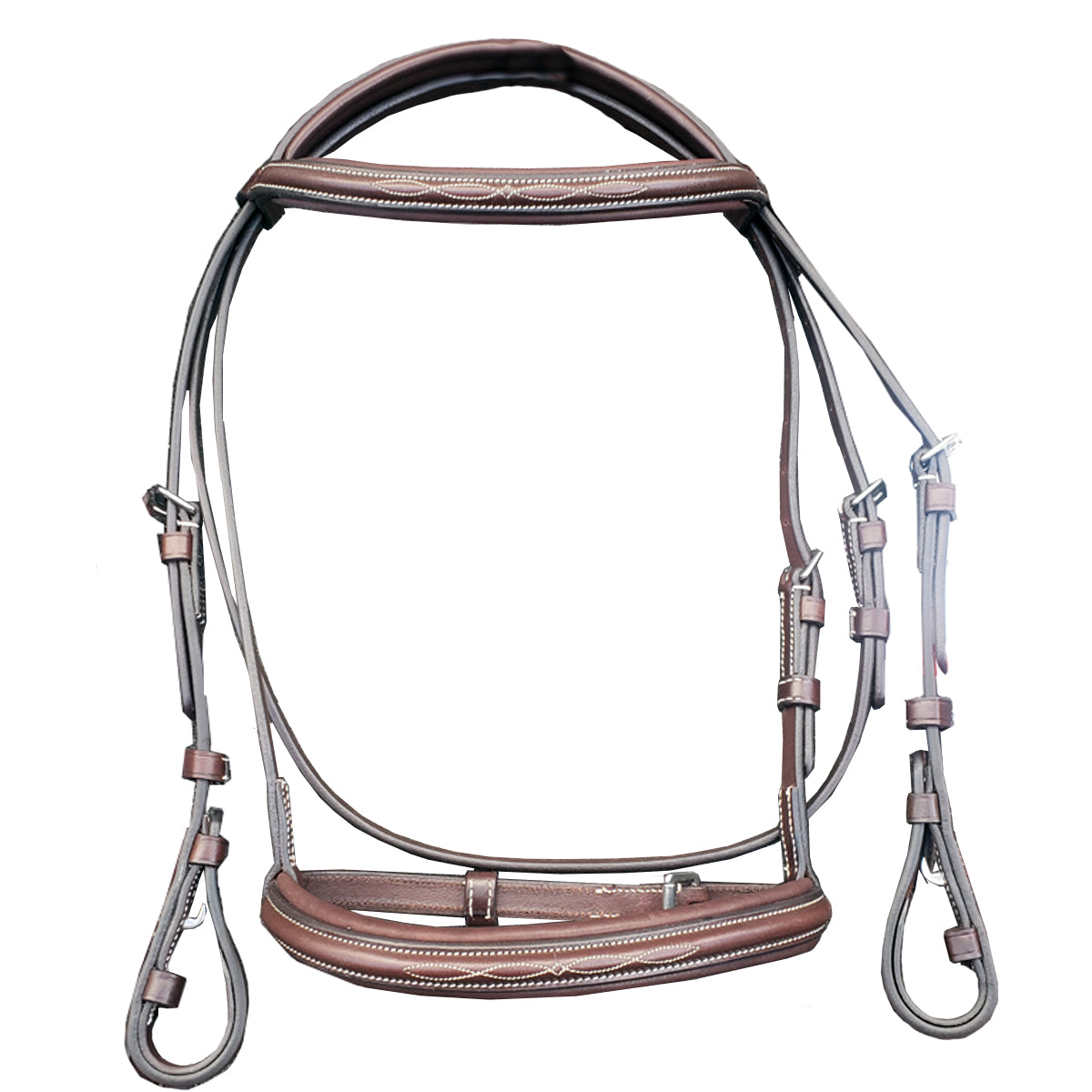 We love this Equiline Pony Bridle because it offers soft padding, beautiful fancy white stitching and comes with reins!