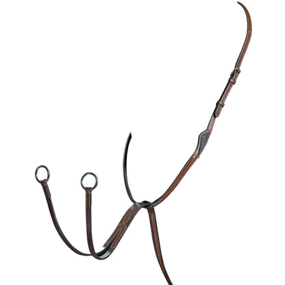 A classic leather running martingale that limits horses upward head movements by adding leverage through reigns and bit.
