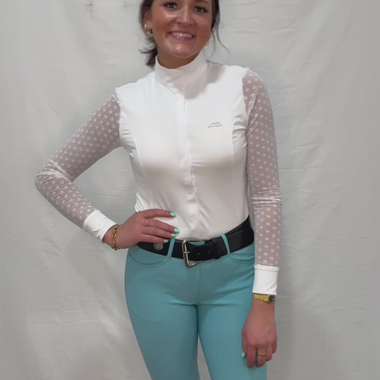 Experience classic elegance in the Carrid Long Sleeve Competition Shirt. Crafted with a stretch and breathable jersey lycra, this top keeps you comfortable during your summer rides. White stretch tulle details on the sleeves enhance ventilation. With quick-dry technology, you can stay dry and focused on your training, making this top a must-have for every equestrian athlete.