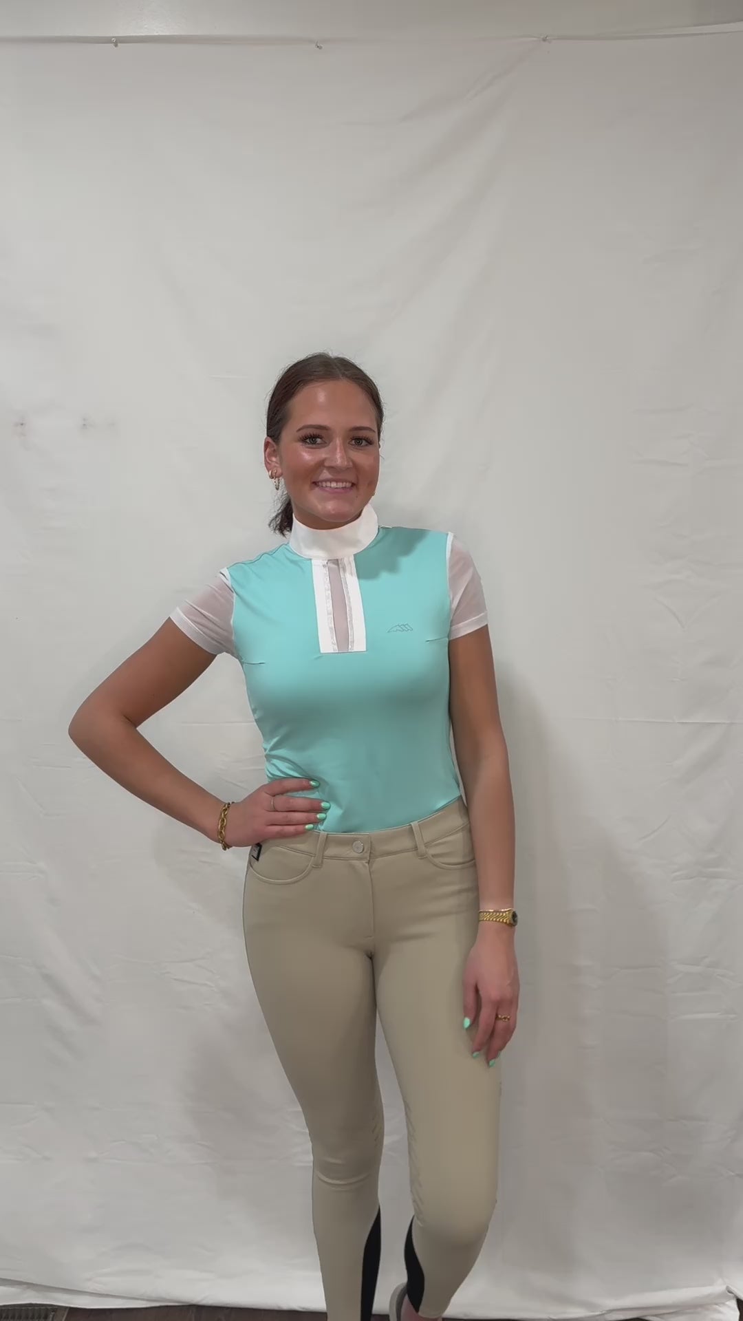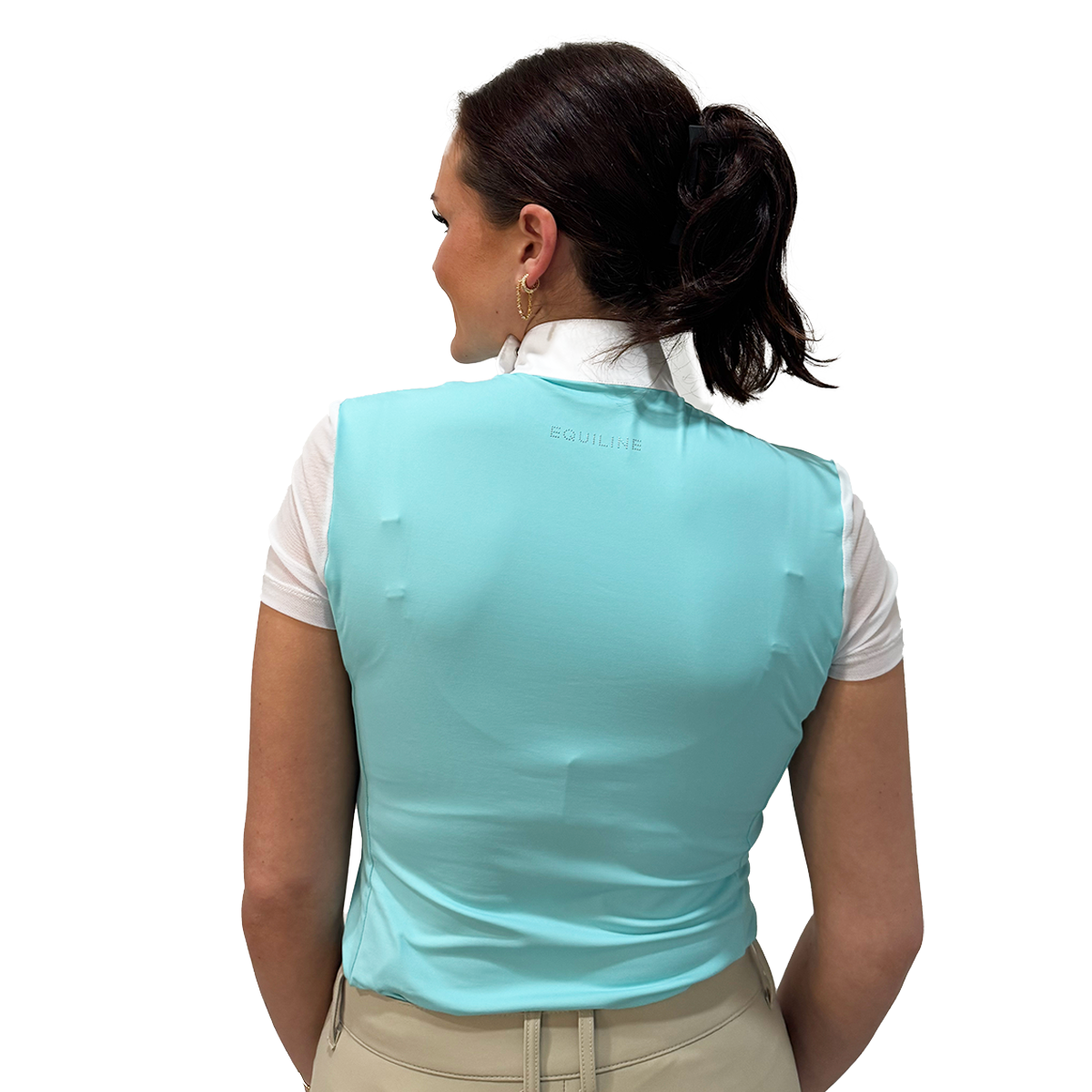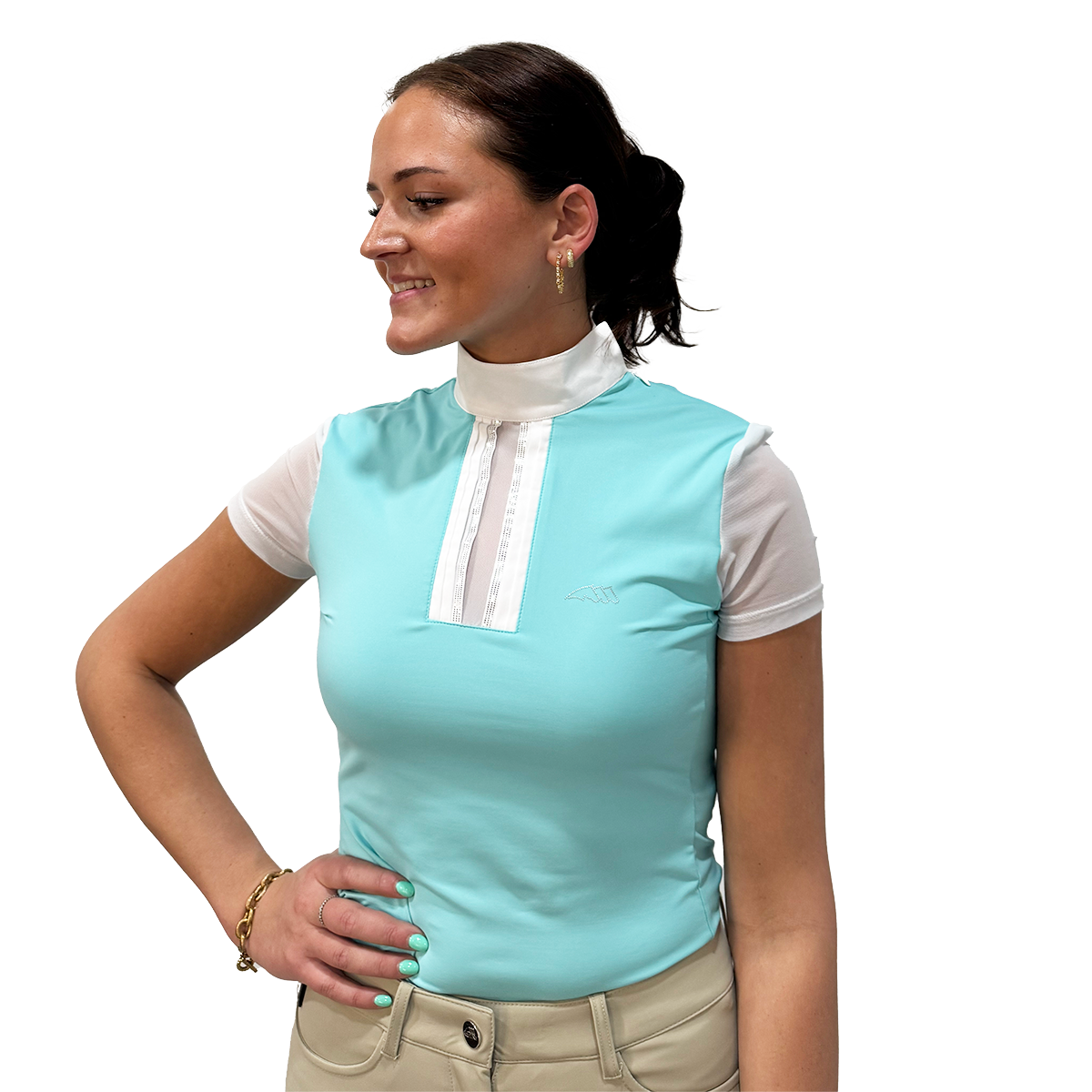 The white stretch tulle on the sleeves adds a stylish contrast, while the silver flat microstuds logo on the chest and “EQUILINE” on the back enhance its aesthetic appeal. With quick-dry technology, this shirt keeps you dry and focused on your performance.