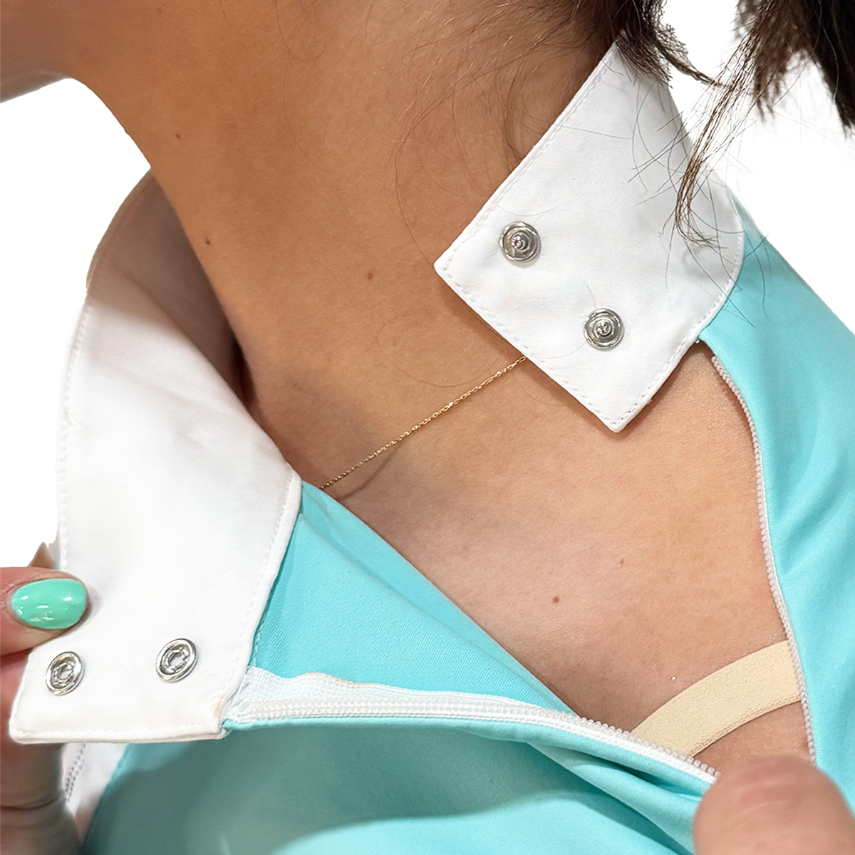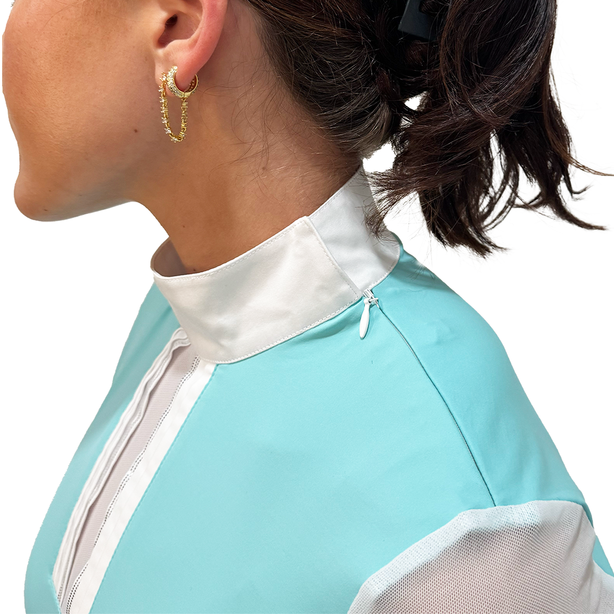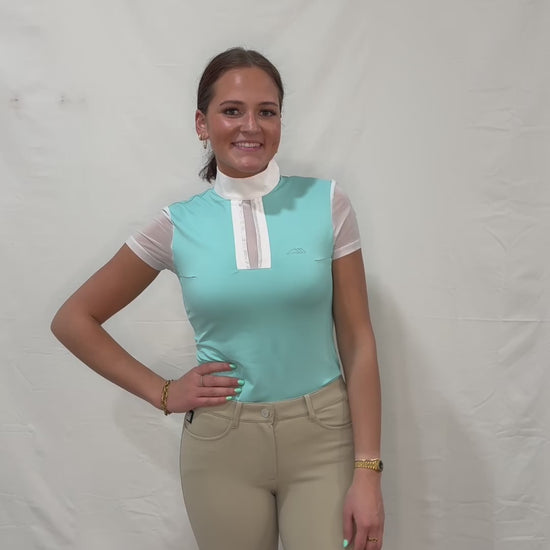 The white stretch tulle on the sleeves adds a stylish contrast, while the silver flat microstuds logo on the chest and “EQUILINE” on the back enhance its aesthetic appeal. With quick-dry technology, this shirt keeps you dry and focused on your performance.