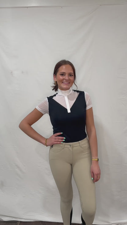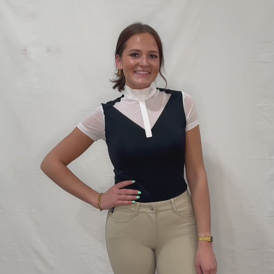 Elevate your competition attire with the Gusteg Woman’s Competition Shirt with Short Sleeves. Crafted from stretchy and breathable jersey lycra, this shirt ensures optimal comfort and flexibility in the saddle. Adorned with white stretch tulle detailing on the chest and sleeves, it exudes sophistication and style.