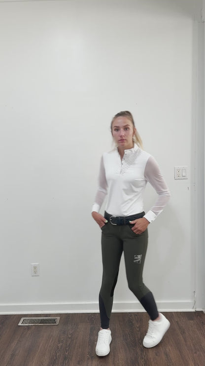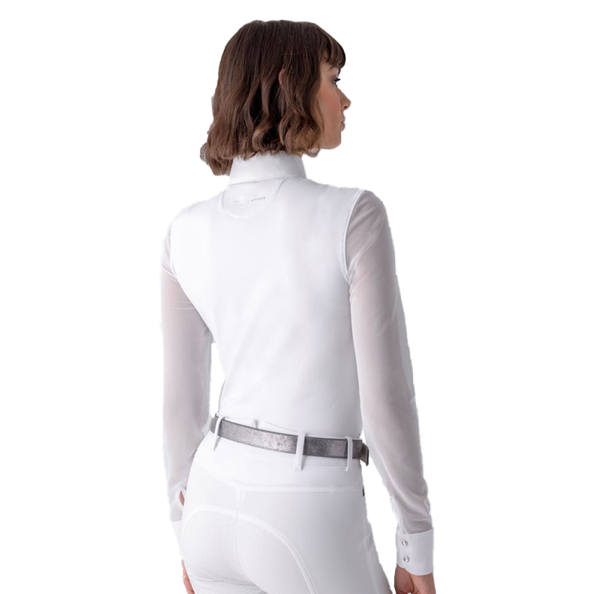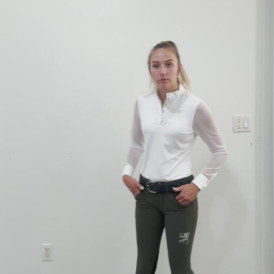 We love this competition polo with tulle sleeves, because of its beautiful look in the ring while not sacrificing comfort and movement.