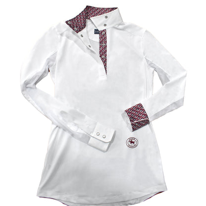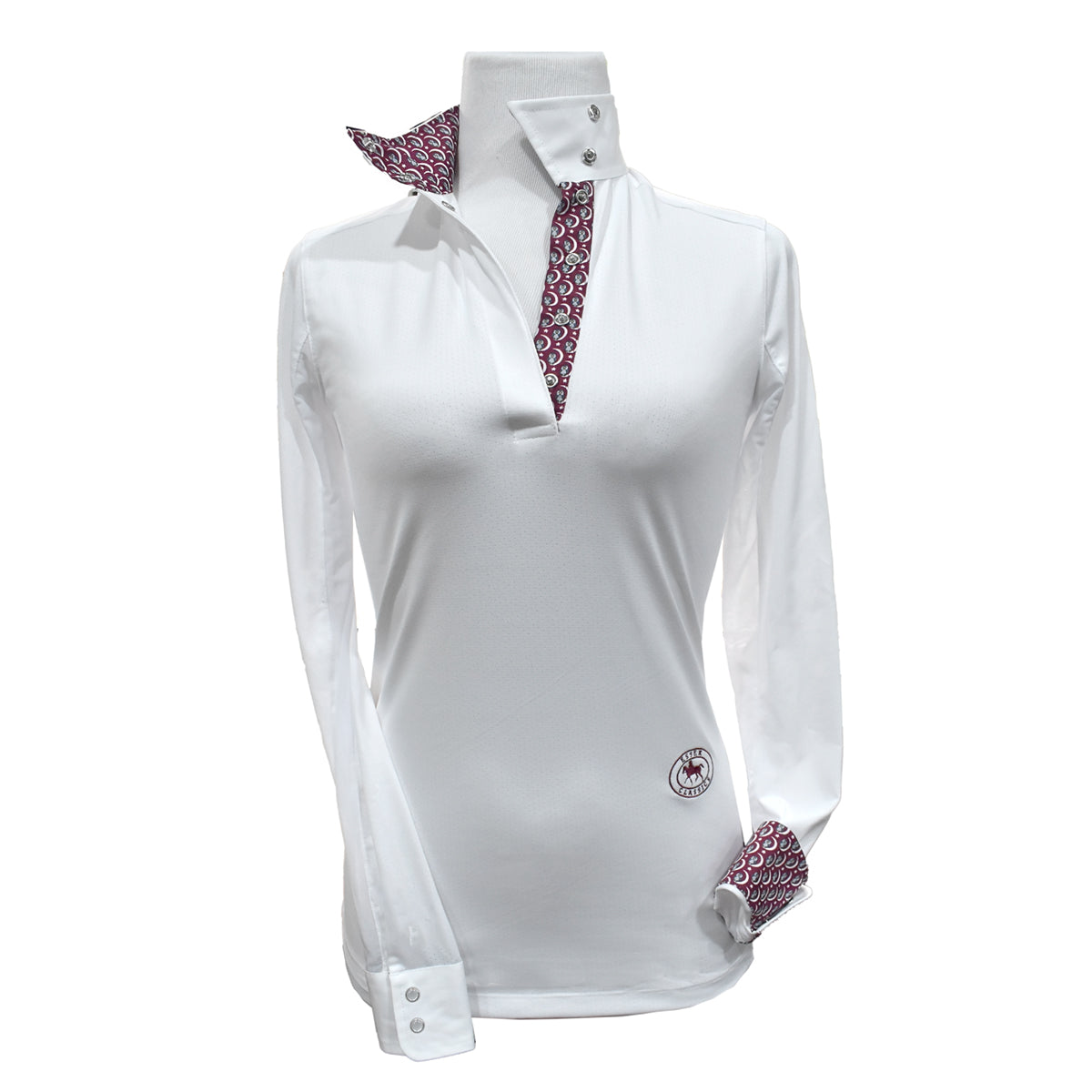 The Essex Classic Talent Yarn Shirt is a popular choice, featuring cool, refreshing nano-tech fabric, under sleeves mesh ventilation panels, and UV sun protection. The Essex Princess Flora Fitted Style Straight Collar Show Shirt features moisture-wicking Coolmax fabric, UV sun protection, and Scotchgard stain resistance.