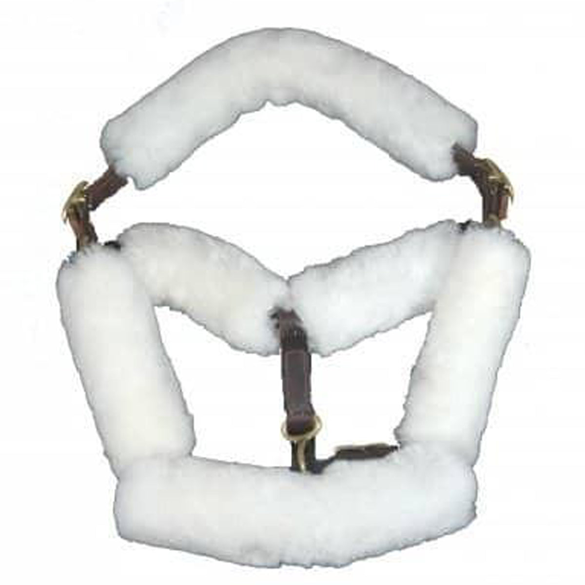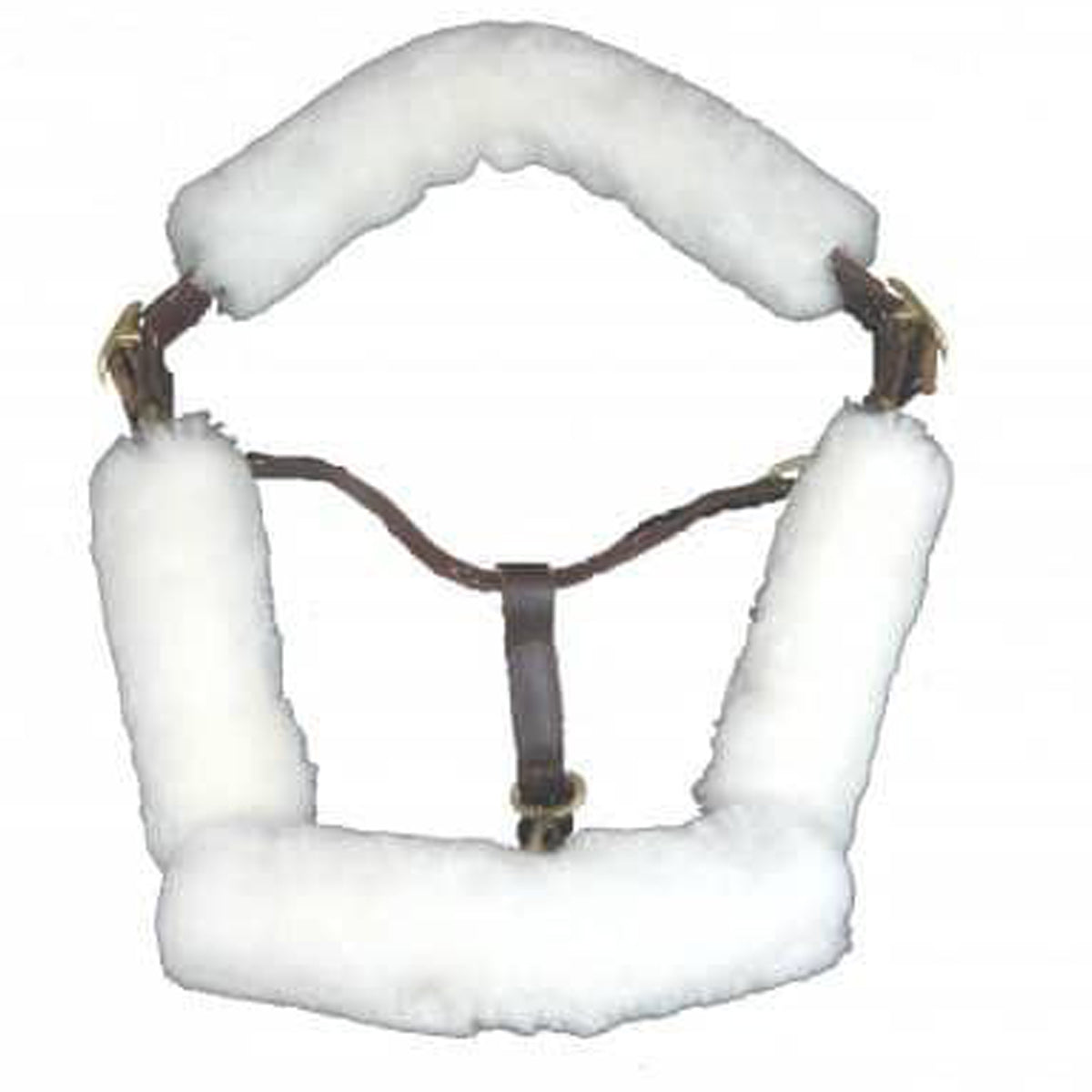 Detachable sheepskin halter set. Velcro closure. Available in 4, 6, or 9 piece sets. Great for shipping. Covers the basic stress points of your horses halter.