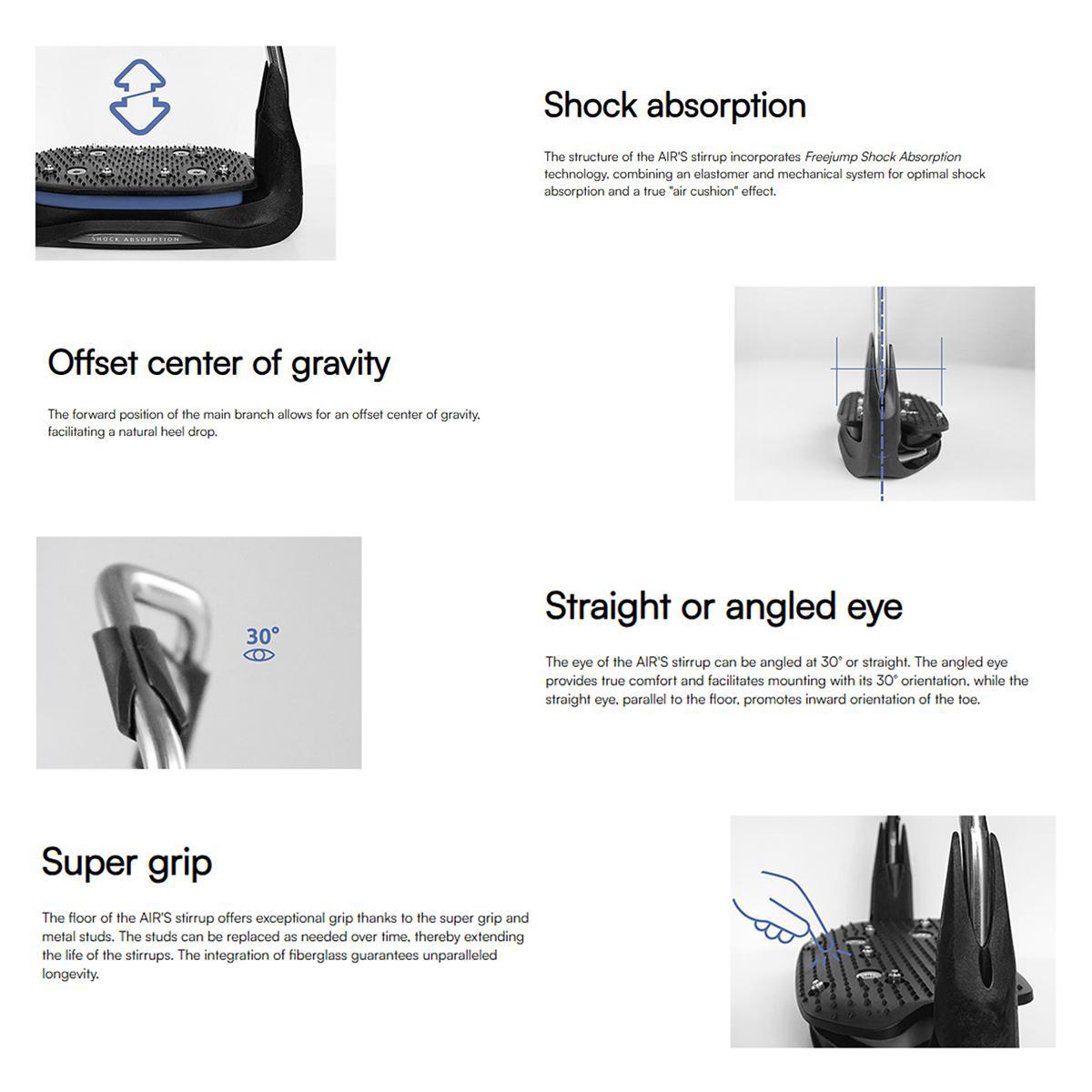 The Air’S stirrups offers a traditional architecture (stainless steel frame) with technical characteristics for more comfort, better balance and optimized grip. The technical options of the Air’S stirrups can be chosen: eye orientation (30° oriented or straight) and inclination of the floor (flat or 10° inclined). The Air’S stirrups are also customizable for a unique look (Air’S Custom stirrups): the colors of the stickers, the top banner, the floor and the elastomer can be chosen from a range of colors and flags.