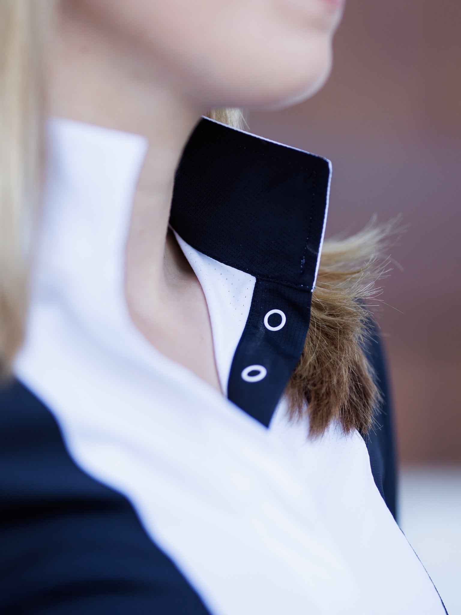 We love these show shirts because they artfully combine the classic good looks of a crisp white shirt in the show ring with a colorful appeal. Paired with a show coat, the white front panel, collar, and cuffs make a crisp, clean presentation in the ring.
