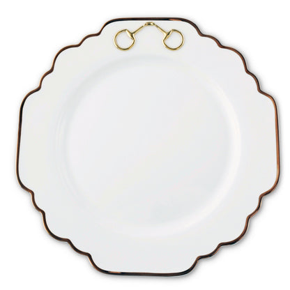 A golden rim and scalloped edge create a sophisticated 10.5-inch dinner plate presented in classic white for easy pairing with other pieces from our coveted Equestrian Collection. Our exacting artisans handcraft the gold-tone snaffle bit from solid pewter.