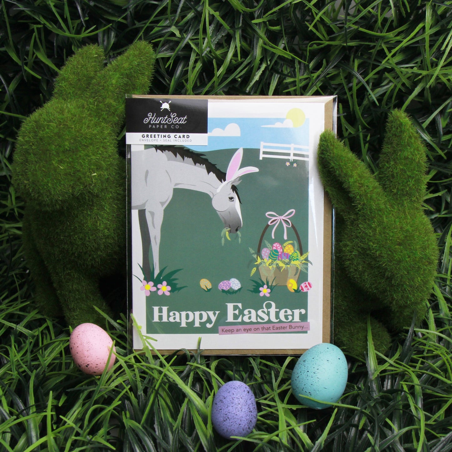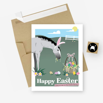 An Easter greeting card for people who know...that their horse would totally beat the egg-hunting kiddos to their Easter Basket...and eat it. Illustrating a horse in a pasture munching on some Easter Basket goodies. Comes with envelope and seal.