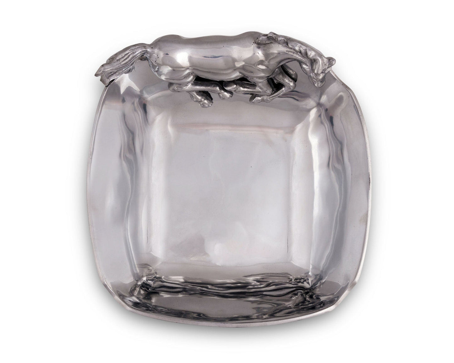 A galloping horse attaches to the inner edge of this piece, its legs working tirelessly to keep it off the bottom. The noble steed's muscular physique and flowing tail provide a lifelike appeal to this handmade, aluminum dish.