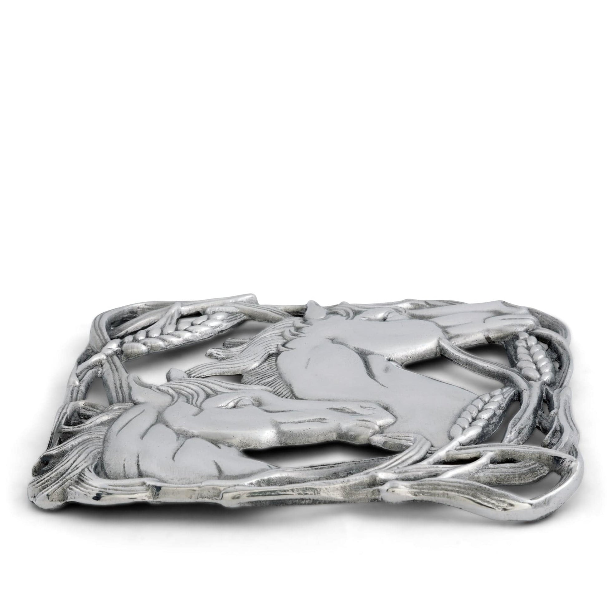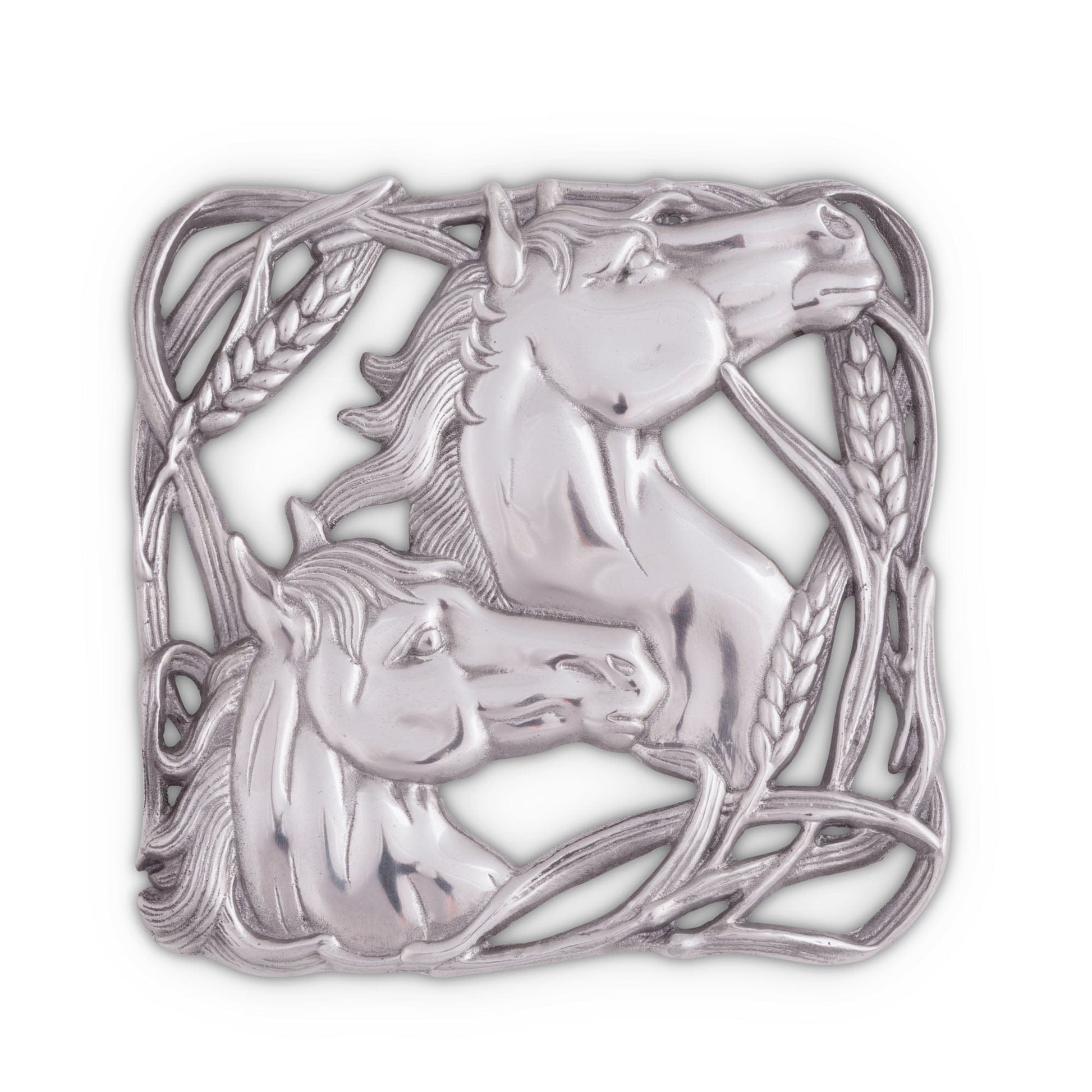 Profiles of stallions merge together in the middle of this dish as interweaving stalks of wheat surround them. The striking detail in the horses' neck and face muscles gives this handmade, aluminum trivet a lifelike appeal.