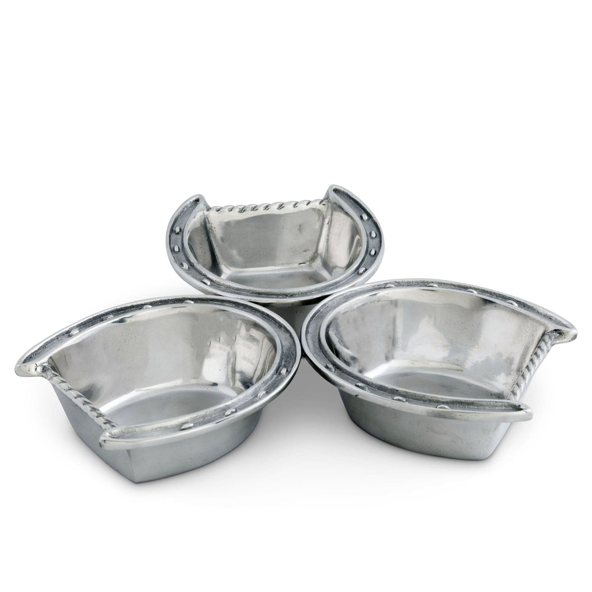 We love this 3-Bowl Horseshoe Bowl from Arthur Court for its unique design featuring three horseshoes joined at the toes with realistic nail details. Handmade from aluminum, its textured notches and ropy edges add character while maintaining a smooth finish, perfect for serving or display.