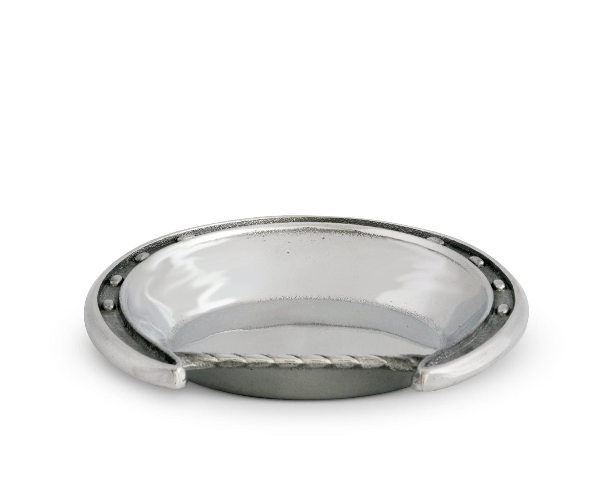 The unmistakable U-shape encloses the dish on three sides, while a ropy edge adorns an additional wall on the heel. Multiple nail notches are visible in the horseshoe, giving this handmade, aluminum bowl even more realistic detail.