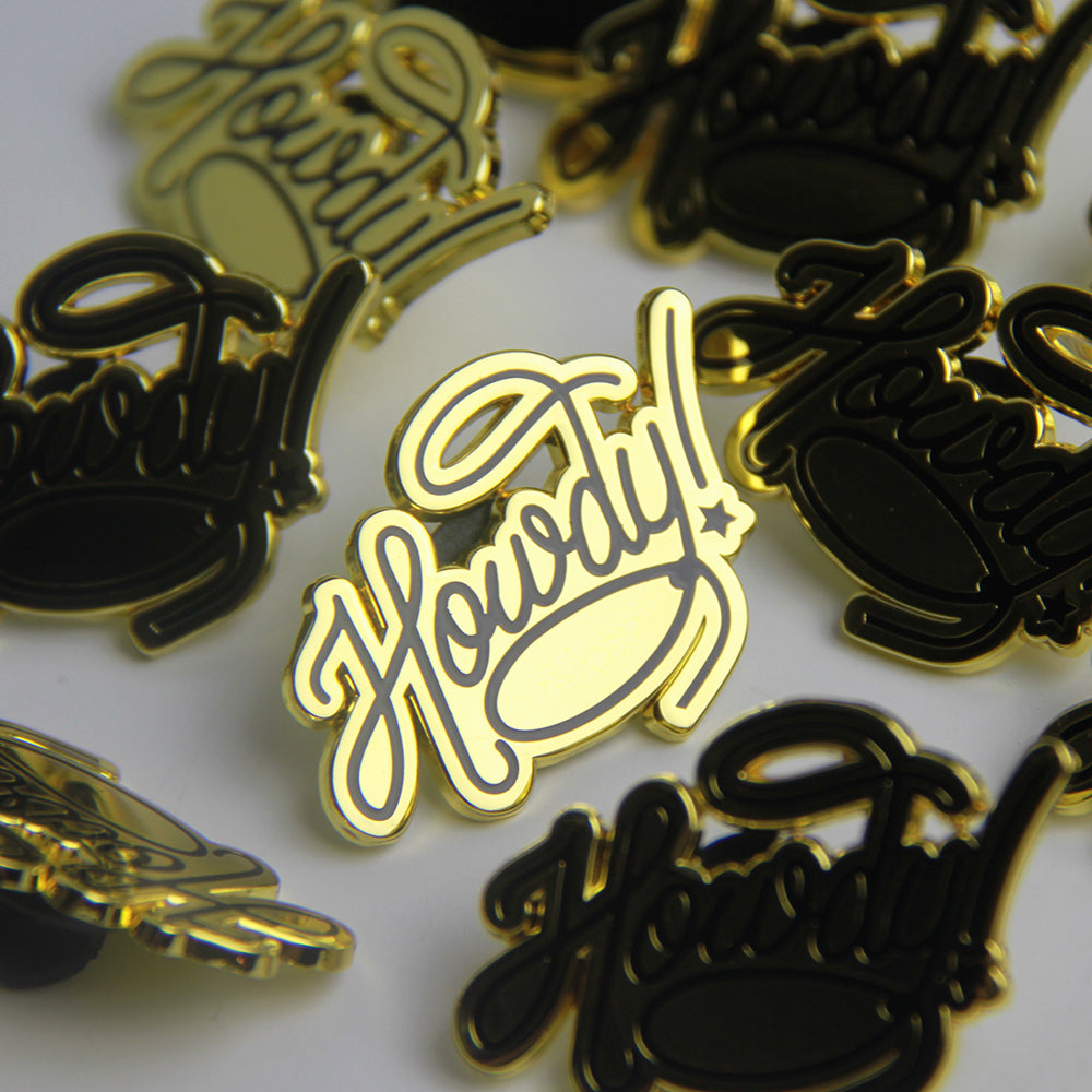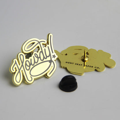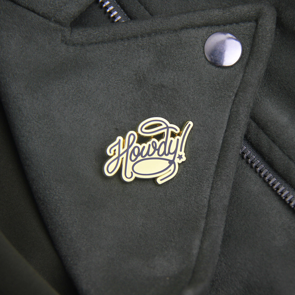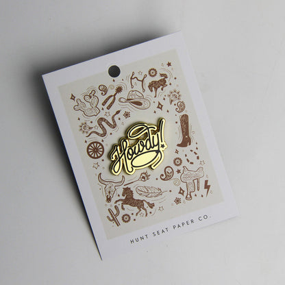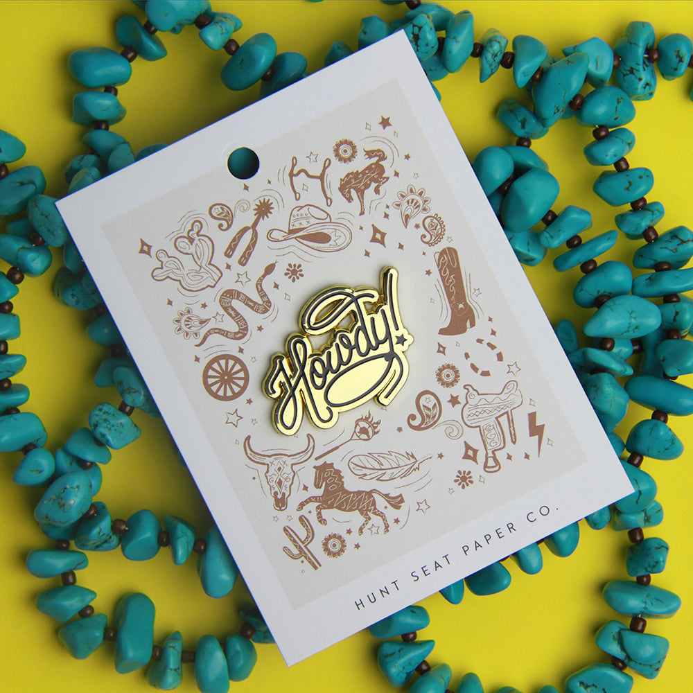 Let them know, you say Howdy! Cowboy gift idea lapel pin with shiny gold plating. Perfect small gift to bundle with our matching Howdy! Greeting Card, Notepad, and Swedish Dishcloth.