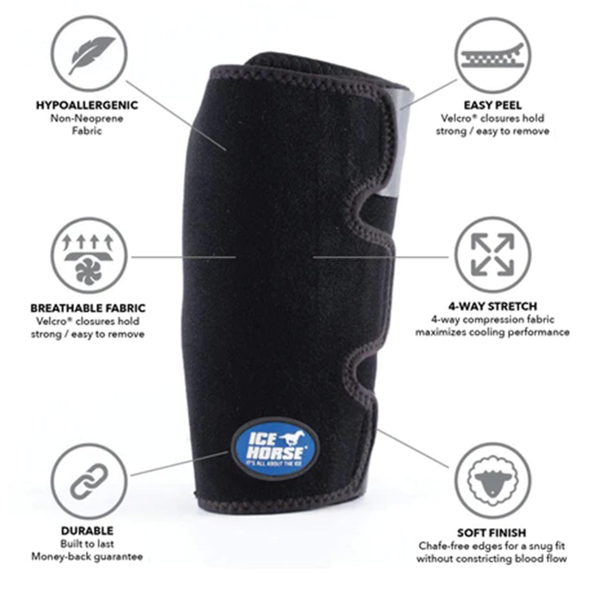 We love the easy-to-use Ice Horse® Knee Wraps that provides uniform compression and coverage to reduce heat and swelling around the entire knee joint. Comes with a suspender strap so the wraps stay in place.