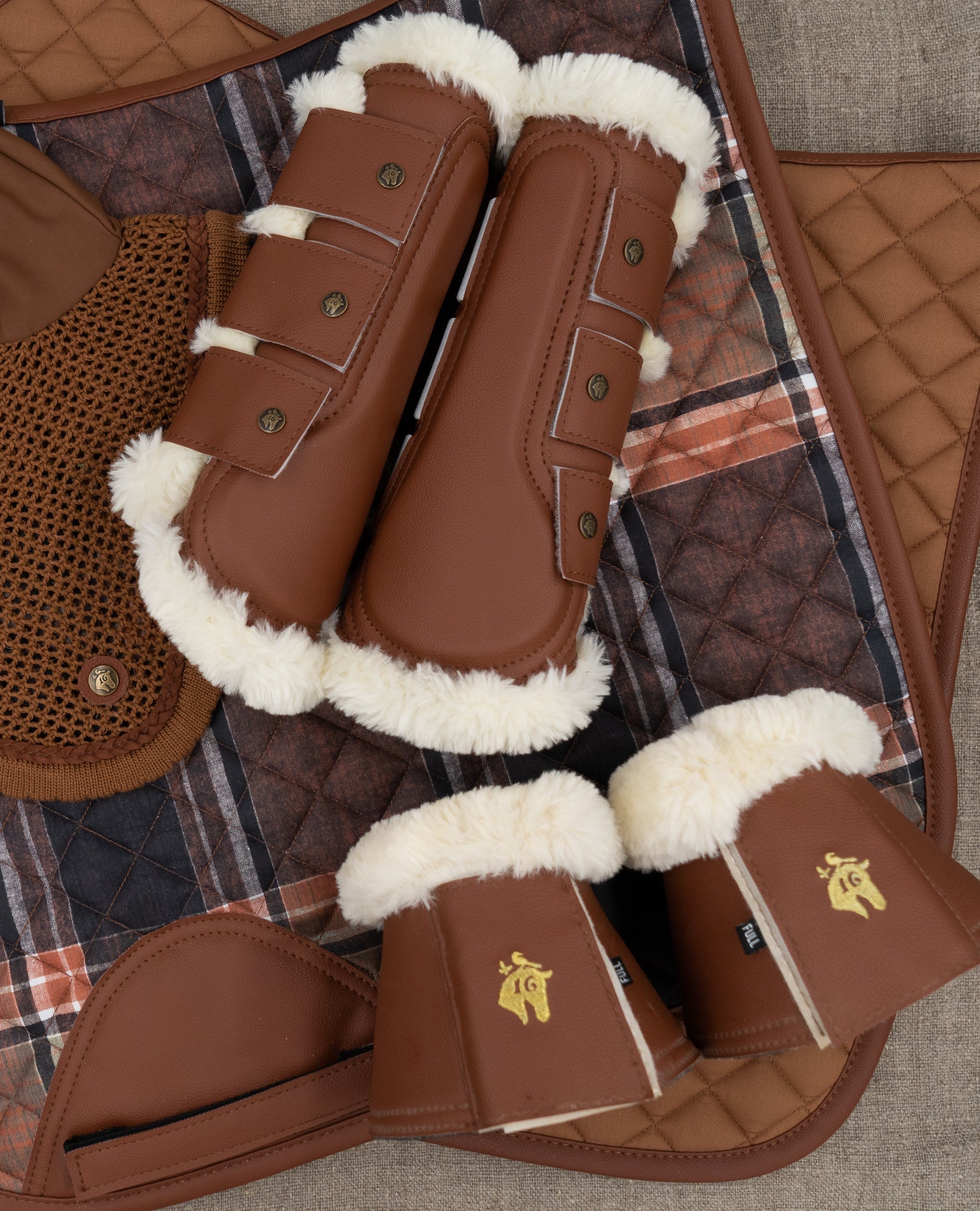 We love these Sixteen Cypress Leatherette Bell Boots in cognac for their stylish blend of protection and comfort. Featuring a neoprene foam base with a durable leather alternative outer layer, they effectively guard against overreach. The ivory faux fur trim prevents rubbing while the secure hook & loop closure ensures a perfect fit. Coordinate seamlessly with the full 16C range for a polished look.