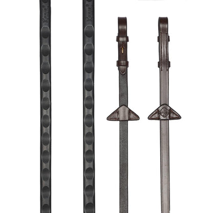 Make your grip stick to the reins like magnets with these straight grip reins with a textured rubber overlay. The rubber grip is textured to your thumb shape, giving you a unique purchase on the reins in any weather. The leather is nylon lined to prevent stretching or breaking. Our signature LeMieux stamped leather martingale stops lend distinctive style. Buckle bit attachments complete the look.